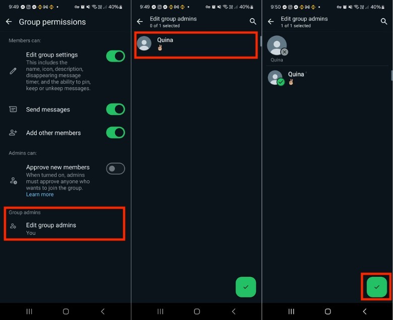 Next to the name of the contact you want to make a group admin, check the circle.