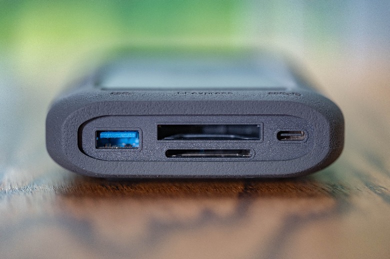 In terms of ports, each end of the UnifyDrive UT2 is crammed with them. There's CFexpress Type B and UHS-II SD card readers which also support TF and CFexpress Type A with adapters, so you can plug storage media from cameras or drones directly into the UnifyDrive UT2. Backup is as simple as a single button press, and doesn't require the drive to be connected to your phone or computer.
