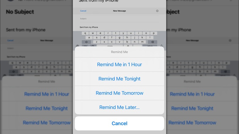 All you have to do is open the email you want a reminder of, then tap on the reply button at the bottom. You'll notice that Remind Me is the very first option you will see on the list. When you tap on it, a pop-up presents you with four different timeframes: 1 Hour; Tonight (where a reminder is set for 9 p.m. local time); Tomorrow (sets it for 8 a.m. local time), and Later, which lets you manually set a date and time for your reminder, no matter how far you want it to be.