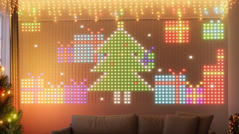 Another option is the Govee Curtain Lights 2. These are RGB fairy lights that hang like a beaded curtain. That might not sound too exciting on its own, but each light is individually programmable. This means that they can be used like pixels to construct optical images out of the light array that is then displayed across the curtain. These aren't just static images, either. The Govee Curtain Lights 2 can display fully animated scenes that actually move. There are over 200 preprogrammed scenes for holidays and other occasions that you can use in your holiday decorations. Some of these are even made to synchronize the lighting effects with music, which is a great addition for parties.