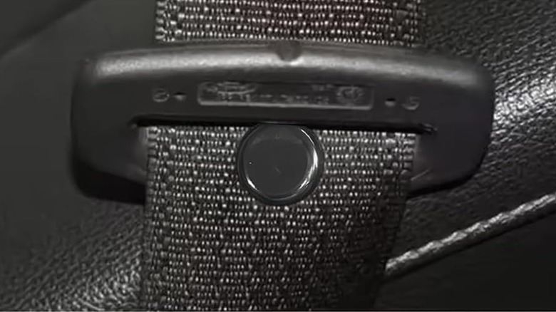 The seat belt is one of the most important parts of your car cabin, a veritable revolution in automotive safety when it first appeared in a car in the 1900s. Seat belts serve as your first line of defense against short stops, whiplash, and bonking your face against the steering wheel. It goes without saying that familiarizing yourself with your seat belt's functions and components can only benefit your overall safe driving experience, though not every part of the seat belt has an immediately obvious purpose. Take, for example, the small plastic button you see in the middle of the actual belt, a short distance away from the latch plate on the waist section, possibly with a twin on the shoulder strap.