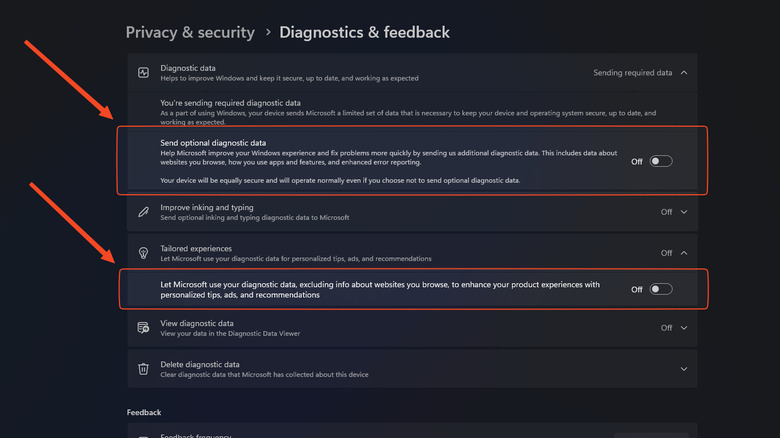 By far the most concerning privacy issue on Windows 11 is the diagnostic data it collects. The required data portion is understandable; things like error collection, information about your device's hardware, system performance, and so on. Microsoft needs that information to keep Windows in tip-top shape, and it doesn't present a huge issue to your privacy. However, the so-called "optional" diagnostic data, should raise a red flag or two. According to Microsoft, Windows 11 sees which websites you visit and the things you do on your device. Even more concerning: The setting is on by default, so head to the Settings app to switch it off. Go to Settings > Privacy & Security > Diagnostics & feedback, and then turn off the toggle for "Send optional diagnostic data."