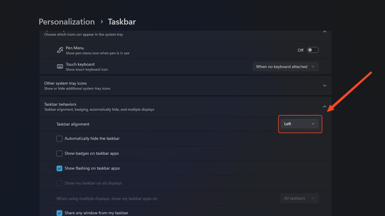 For the Start Menu's position, head back to the Settings app, then Personalization > Taskbar. Scroll down until you find Taskbar behaviors. Click the drop-down menu beside taskbar alignment and change it back to left. Done and done.