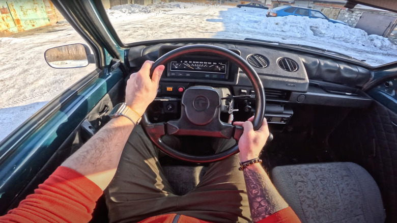 Most Okas were powered by tiny two-cylinder engines that drove the wheels through a four-speed manual transmission. In order to drive it, you had to sit in this utterly depressing interior. We can't sugarcoat it, it's really that bad. It's an endless sea of black plastic, two climate control vents that point upwards despite being meant for the driver and passenger, a couple of switches, and a speedometer. If you want creature comforts, you're asking too much.