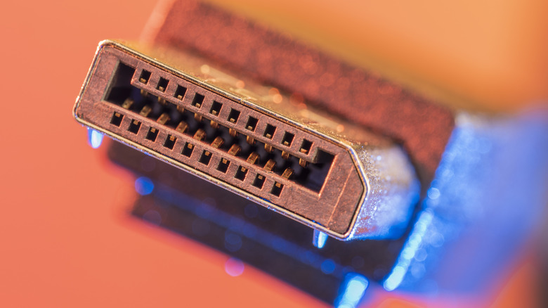 HDMI connectors and ports can be identified by their squished trapezoid shape. HDMI 2.1 is the latest version of the interface, and it can carry video and audio signals at up to 48 gigabits per second (Gbps). As we'll cover in the next section, that pales next to DisplayPort bandwidth, but that shouldn't matter for most applications. A 4K video signal at 60 frames per second, which is the highest quality you'll usually find for movies and TV, uses about 12 Gbps of bandwidth. So, although DisplayPort has superior capacity, most consumer electronics like televisions, projectors, and game consoles opt for HDMI. However, HDMI 1.4 and below are not suited to 4K video. The interface also supports HDR video from version 2.0 and up for better dynamic range and contrast. Where HDMI outshines DisplayPort is with eARC, which allows users to pass audio formats from the signal source to a soundbar instead of needing a coaxial cable.