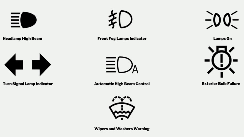 It's good to be familiar with the lighting and visibility symbols on your Ford dashboard as well: the headlamp high beam, front fog lamps, lamps on (low beam headlights), and turn signal indicators each come on when those specific lights are in use. For the turn signal indicator, the symbol will flash the left or right arrow. If the light starts flashing at double speed, it could mean you need to replace a turn signal bulb. The automatic high beam control icon tells you the system is active, and the exterior bulb failure symbol tells you that one of your headlamps is dead or malfunctioning. Don't drive at night, and replace as soon as you can. If you see a wipers and washers warning light on your dashboard, your windshield washer fluid is running low and needs a refill.
