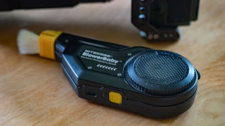 I personally use a Nitecore Blowerbaby, which is a pocket-sized electric air blower, and it does a fine job of cleaning off my camera and other gear. It has both hard and soft brushes available to purchase separately which clip onto the blower, so that particles are blown away as they are dislodged by the brush. Nitecore also sells a newer, upgraded model for $69 on Amazon, and after long use, I can confidently say that these devices are well worth your money.