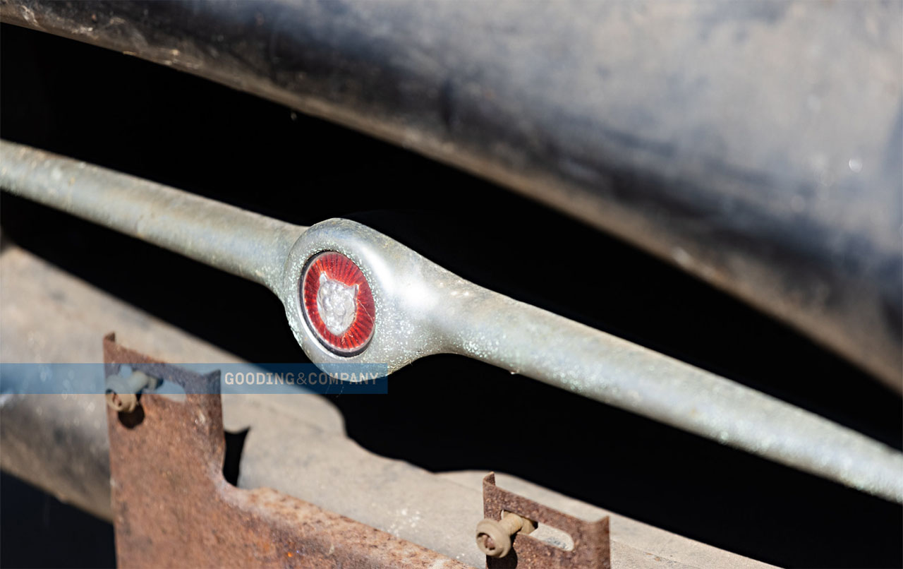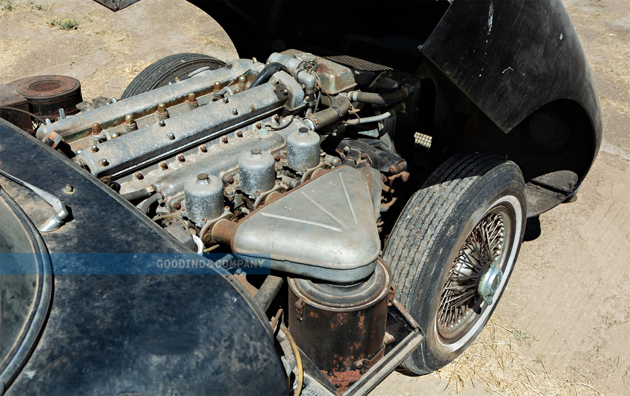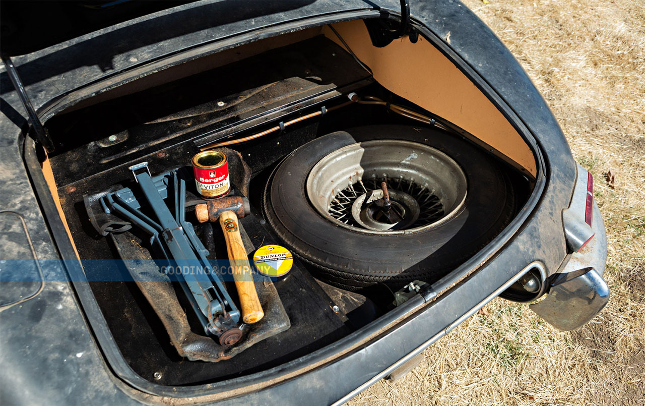 It has the appearance of a car that's been stored for an extremely long time, and being stored without being operated and driven is one of the worst things that can happen to a car. The images show the Jag is still wearing its original wire knockoff wheels and has its original toolkit.