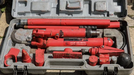If brute force had a tool form, it would be the Porta Power. Porta Power is a portable hydraulic ram system with a compact setup that converts hydraulic pressure into mechanical force. You're likely to find them anywhere something bent, twisted, or stuck needs a firm nudge back into place. Think auto body shops, construction sites, heavy equipment, and repair bays. It's also a useful and versatile find if you're looking to set up your own home body repair and paint shop.