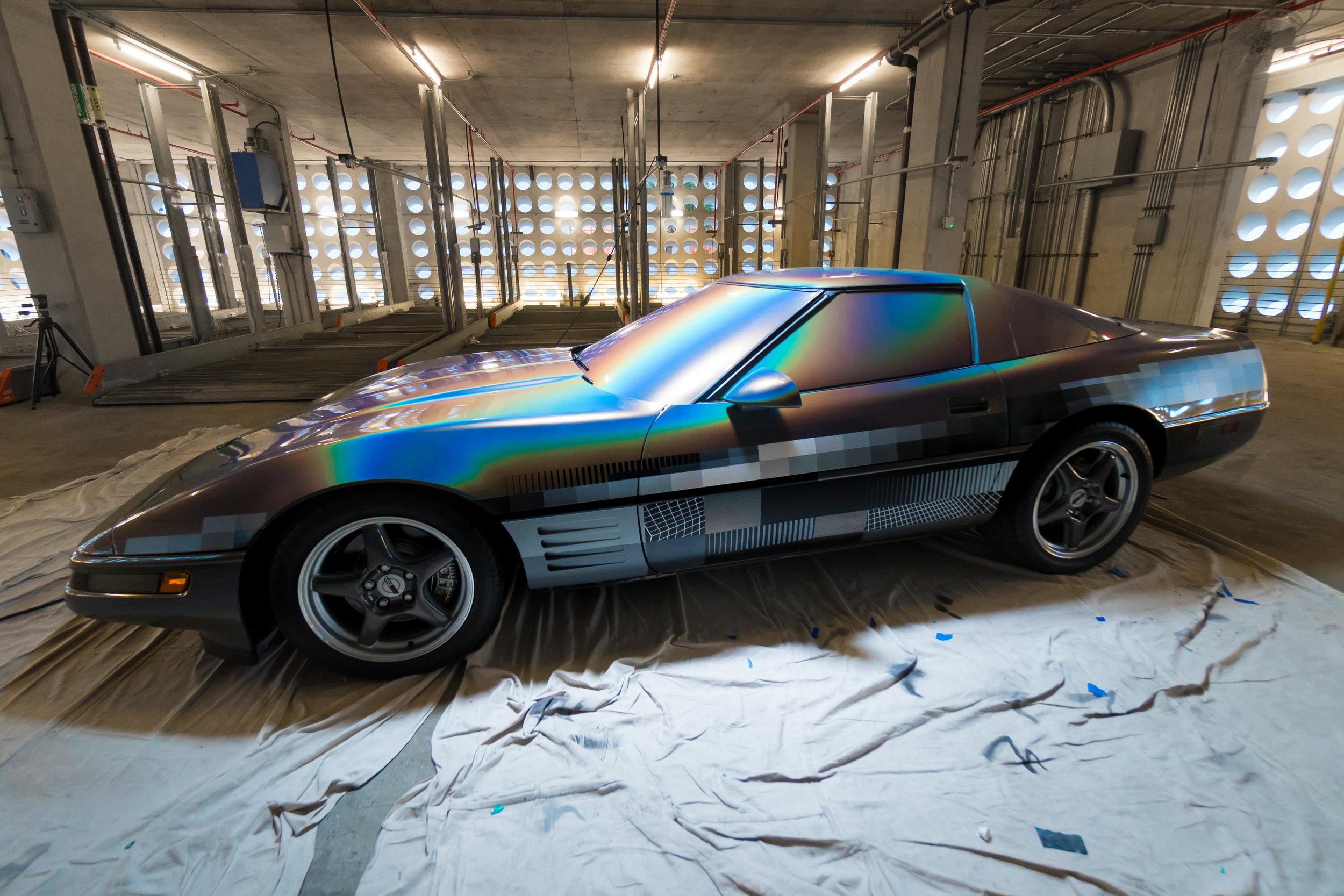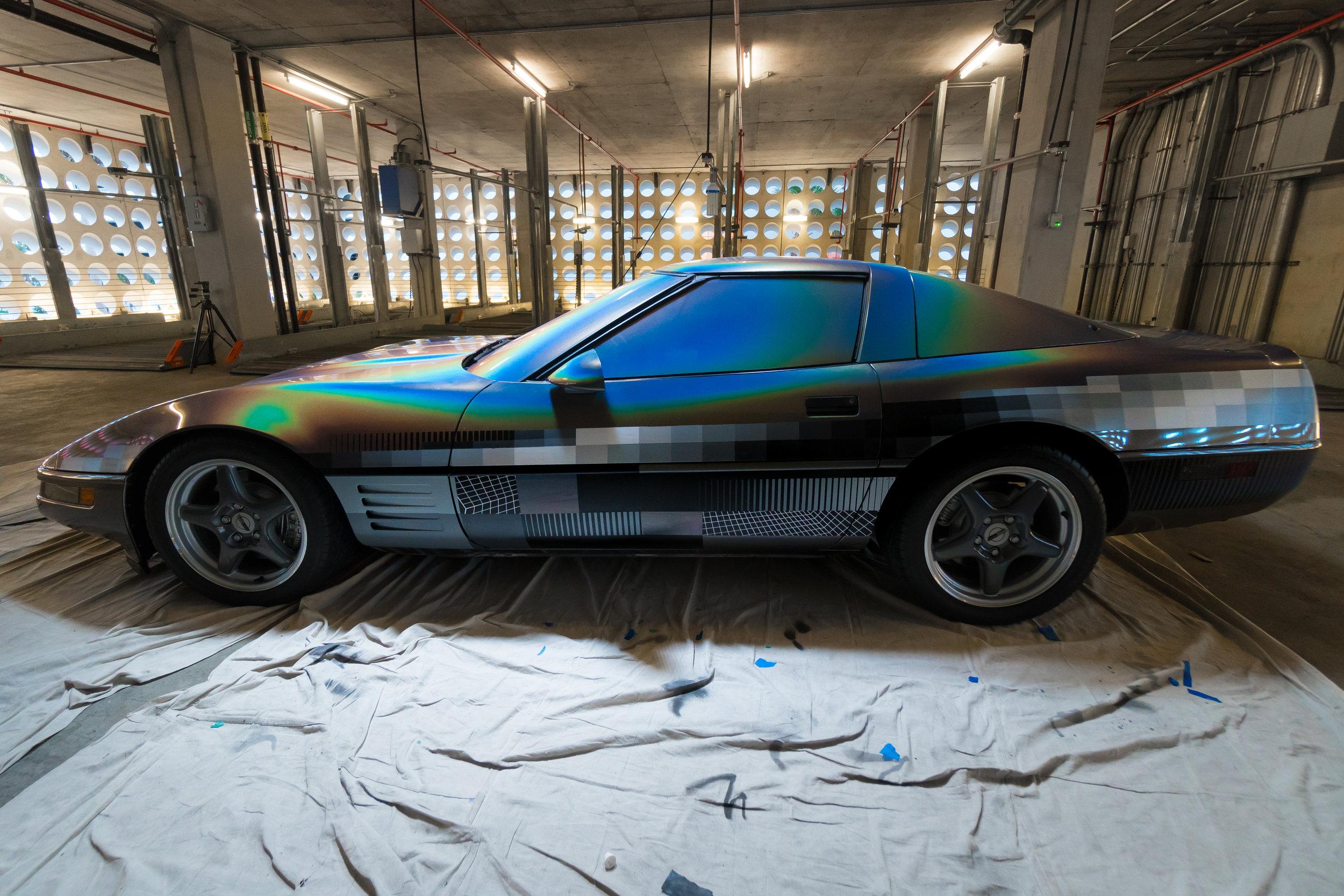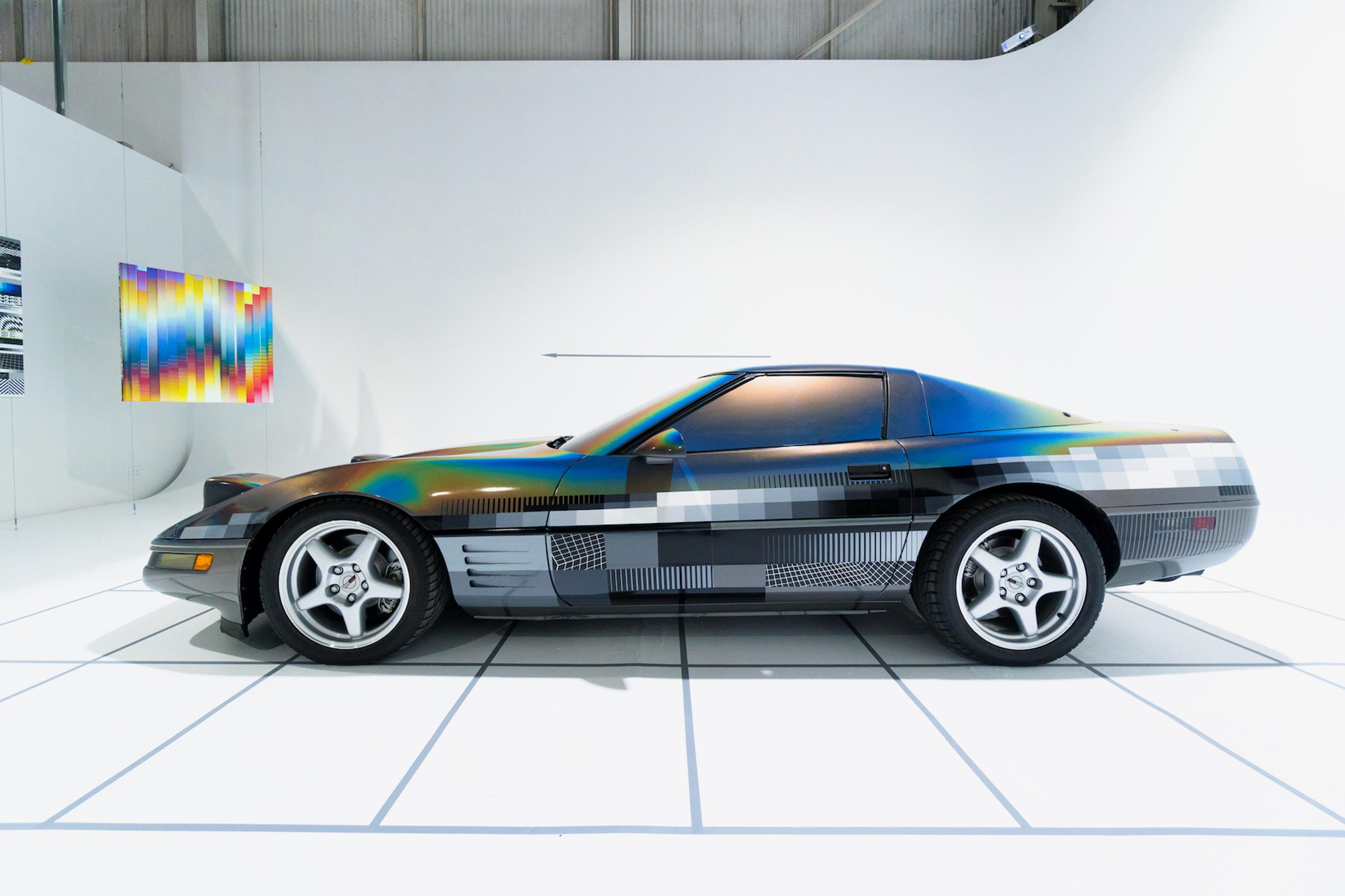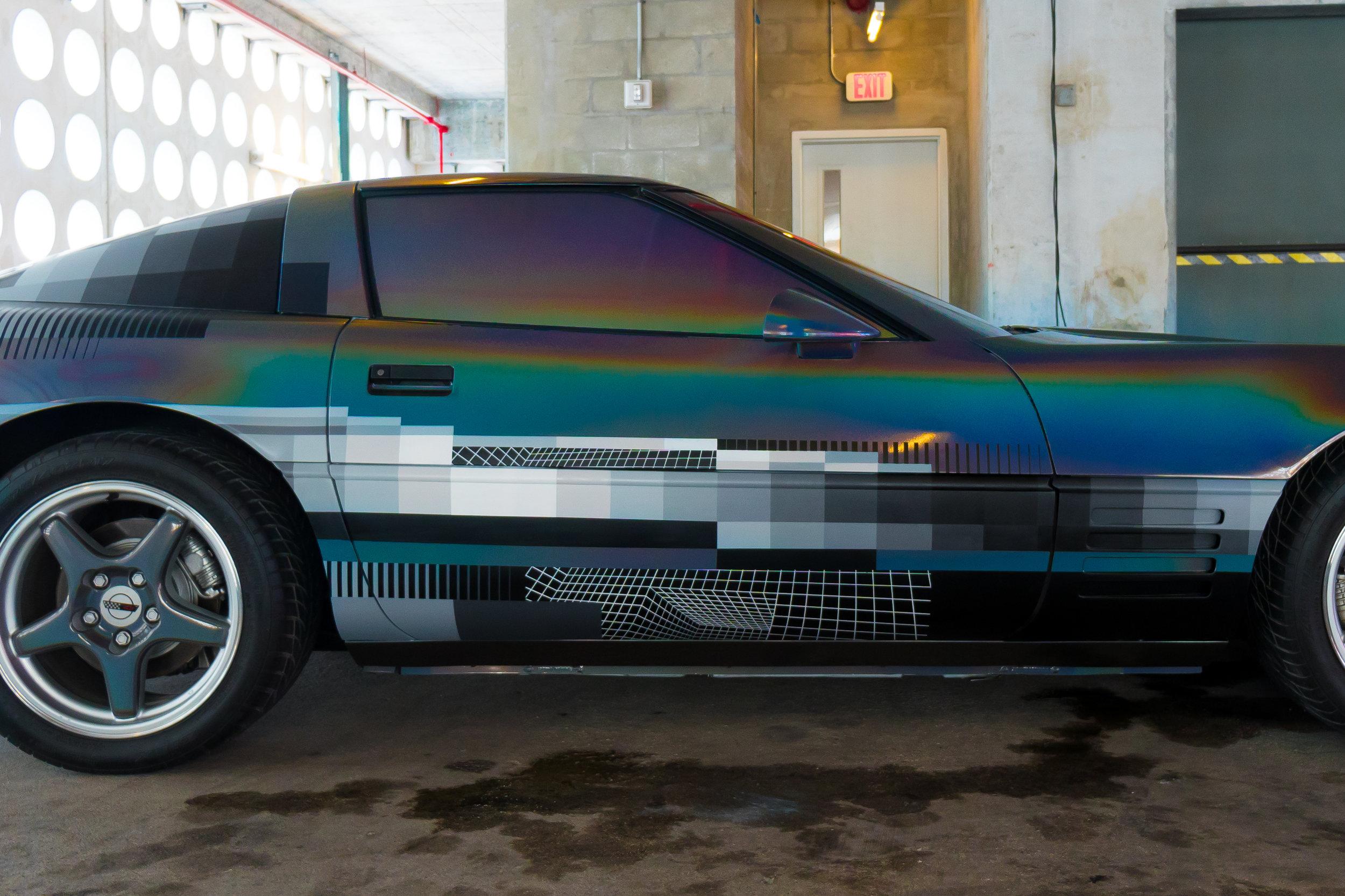 This week anonymous artist Felipe Pantone revealed his latest art piece installed on and in a 1994 Chevrolet Corvette. Die-hard stock paint lovers of the Corvette were probably mortified. Digital madness inspired artwork took the vehicle to a place it'd never been before. Blocks of color, mood ring spray, and the blacks and whites of the video tapes you threw away in 2002 – they're all here.