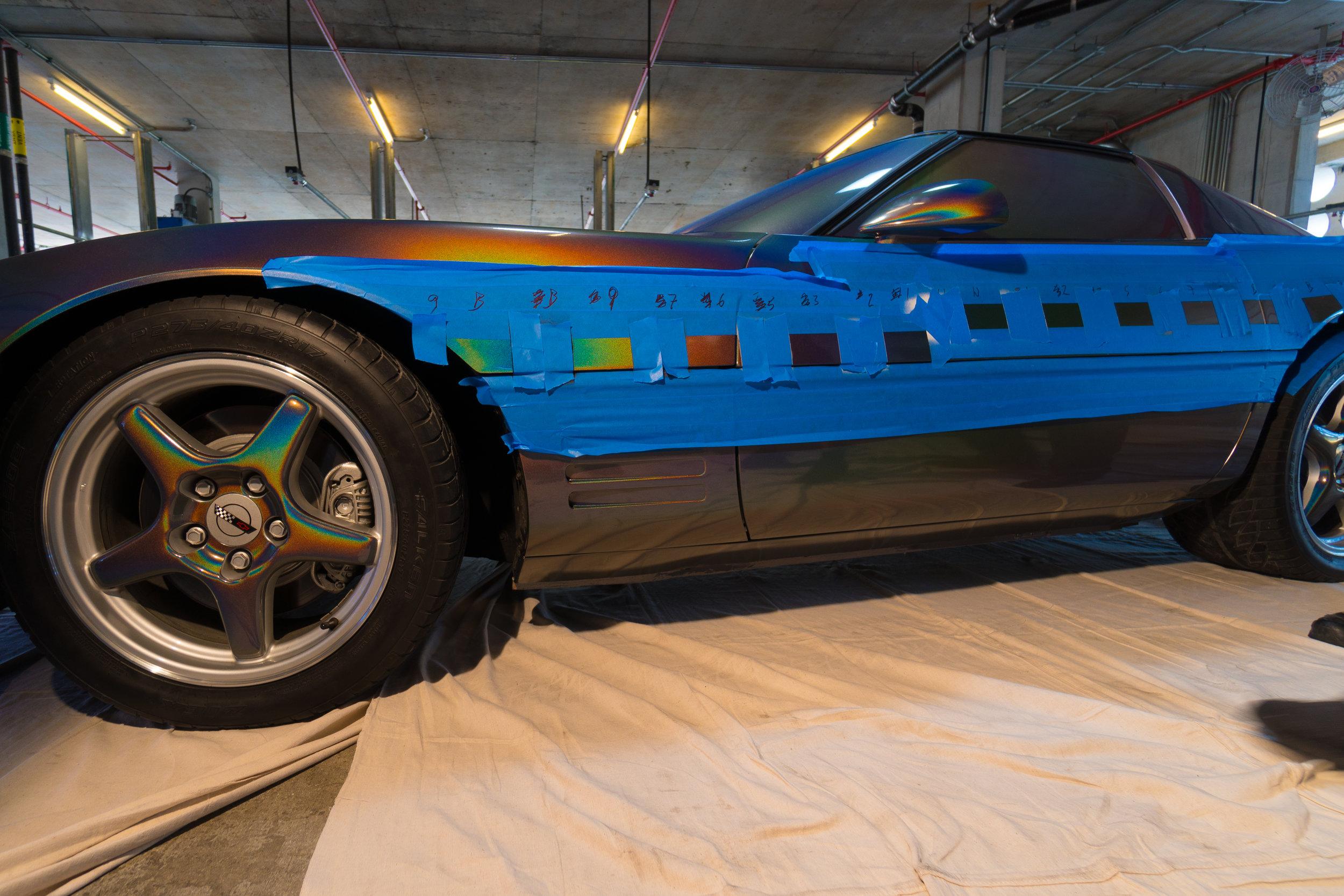 Felipe Pantone shared the images we've got here just before the opening of the door to the exhibit at which they'll be seen publicly. The artwork collection presented here by Panton went by the name "Artifact to Artifact Communication," and it contained several flat works as well as the customized Corvette. All of the works are painted – flat works and vehicle alike. You'll find a number of in-progress photos in the second gallery in this article.