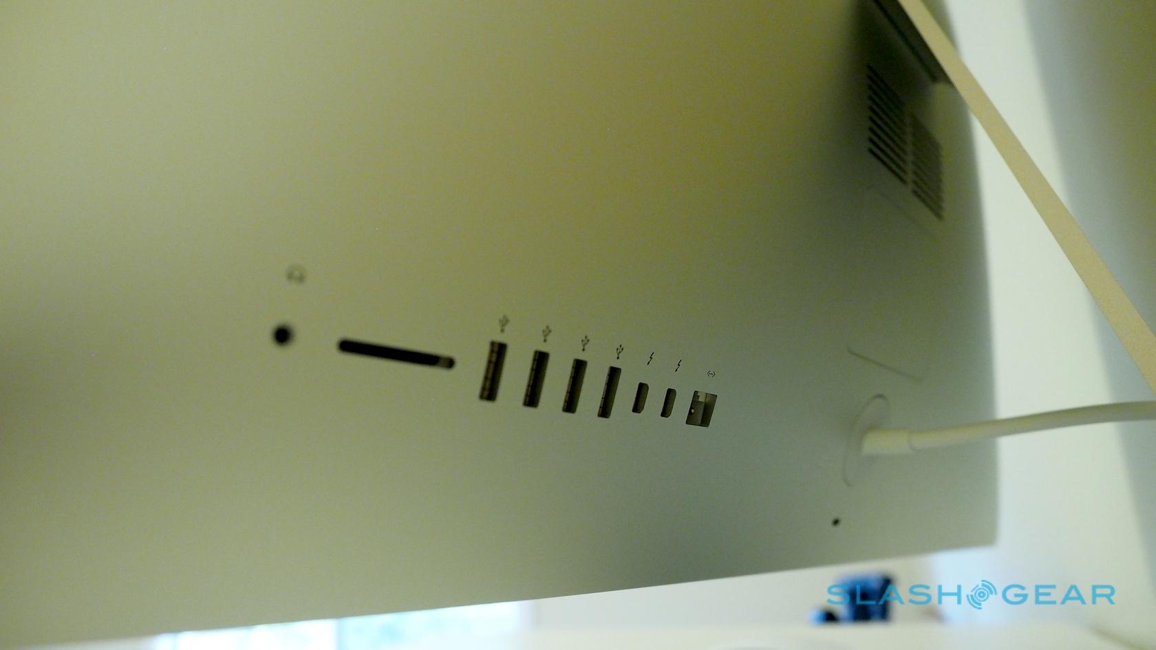 My lingering frustrations with the iMac design in general persist. The ports – headphone, SDXC, four USB 3.0, two Thunderbolt 2, and gigabit ethernet – may be aesthetically pleasing in their organization, lined up like good little soldiers on the voluptuously bowed rear panel, but ergonomically I worry I'm scratching the surrounding aluminum every time I fumble to plug in USB drives, headphones, or a memory card.