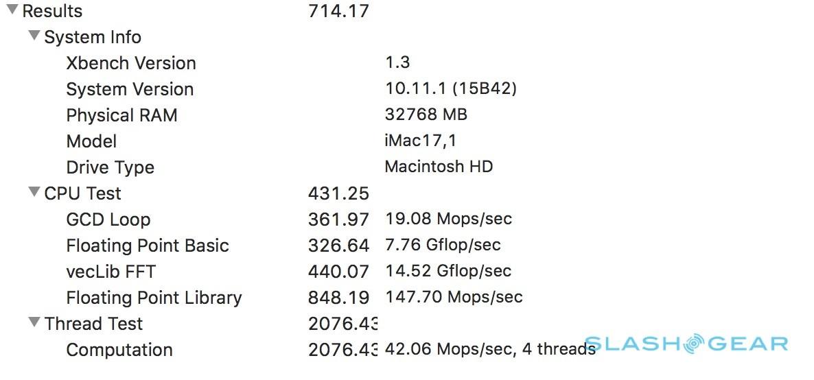The hardware grunt of my maxed-out review unit is borne out in the benchmarks. I started out with Geekbench 3, a synthetic test of processor and memory performance, and the iMac scored 4,606 in the single-core 64-bit test and a whopping 17,680 in the multi-core test. In Xbench, the iMac scored 714.17 in the processor category.