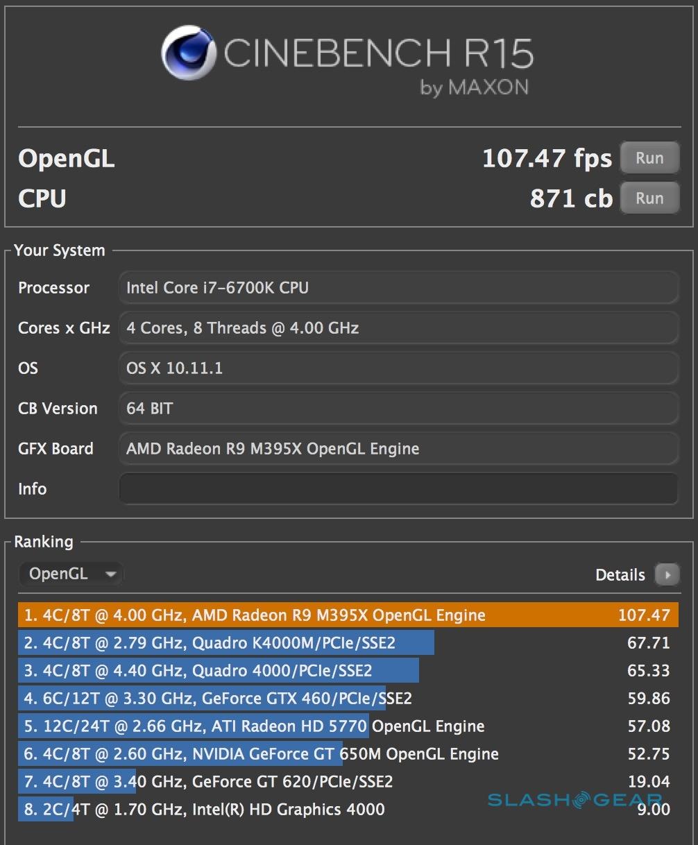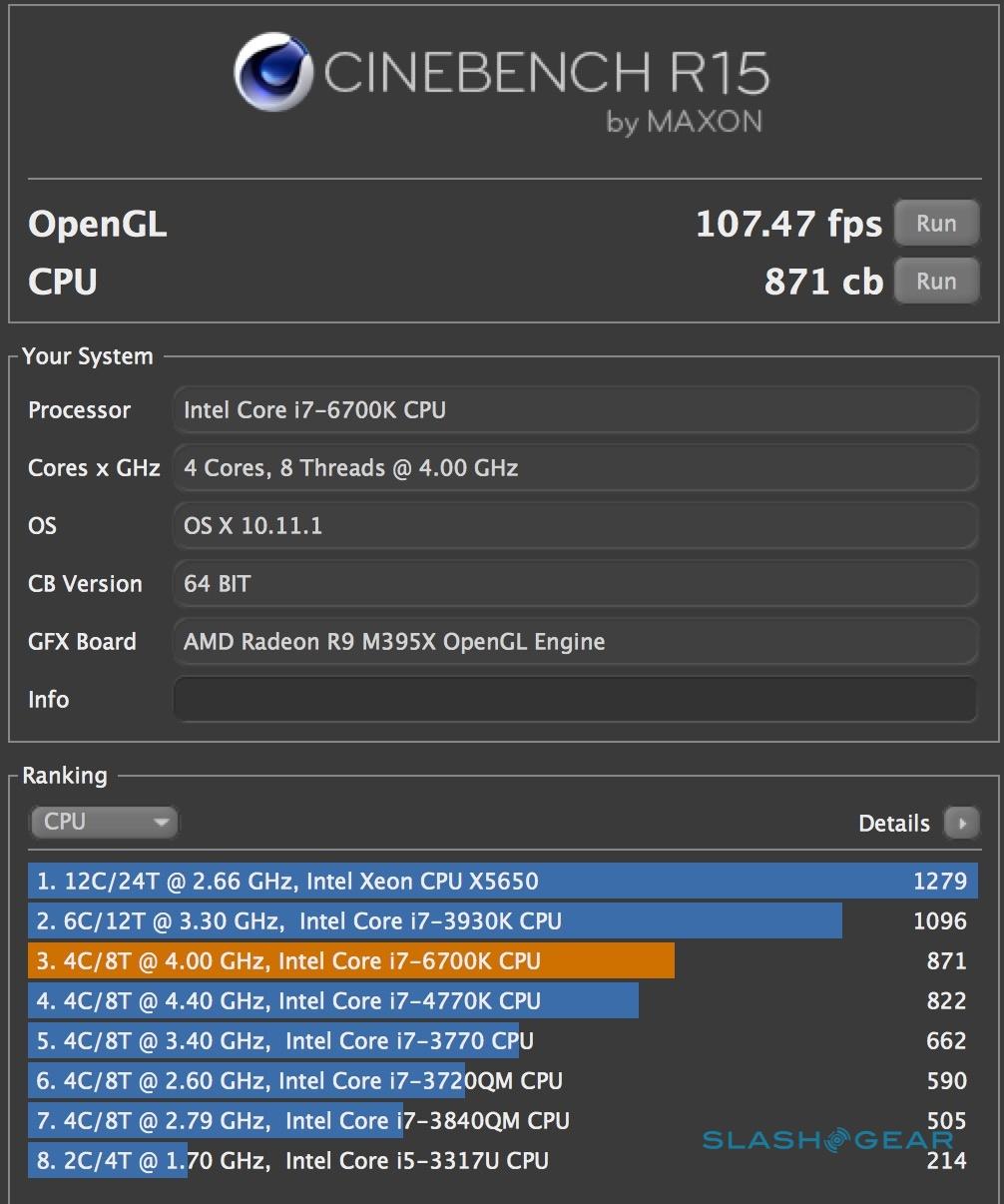 I then turned to Cinebench R15, which tests both the processor and the OpenGL graphics. In the former, the iMac scored 871 overall, only falling short in Maxon's rankings of hexa- and octa-core chips.