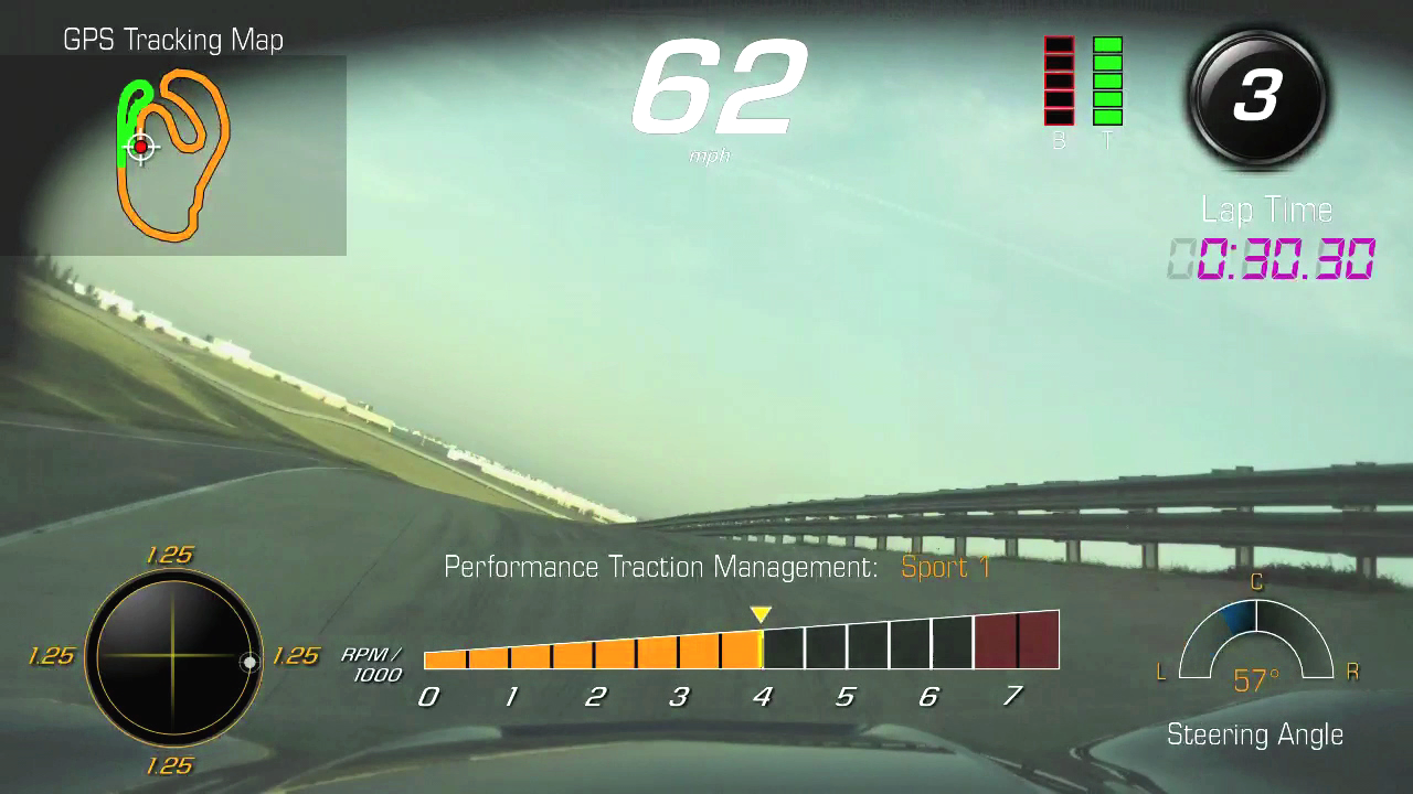Four different views can be selected for the recording, ranging from Touring Mode which keeps only the video – Chevrolet suggests it's best for scenic drives you want a record of – through Sport Mode, which shows the basics of speed and G-force, to Performance Mode, with acceleration, 1/4-mile speed, 0-100-0 mph runs, and elapsed time. Finally, there's Track Mode, which shows everything including engine RPM, location, lap time, and all the other details the PDR has collected.