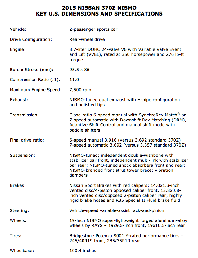 Nissan has revealed its new 2015 370Z NISMO, redesigning the sports coupe inside and out, while doubling the gearbox options. Outside, Nissan's meatiest 370Z variant takes its cues from the GT-R, with a deeper front fascia and LED daytime running lights, unique rear spoiler, and restyled 19-inch NISMO super-lightweight forged aluminum-alloy wheels.