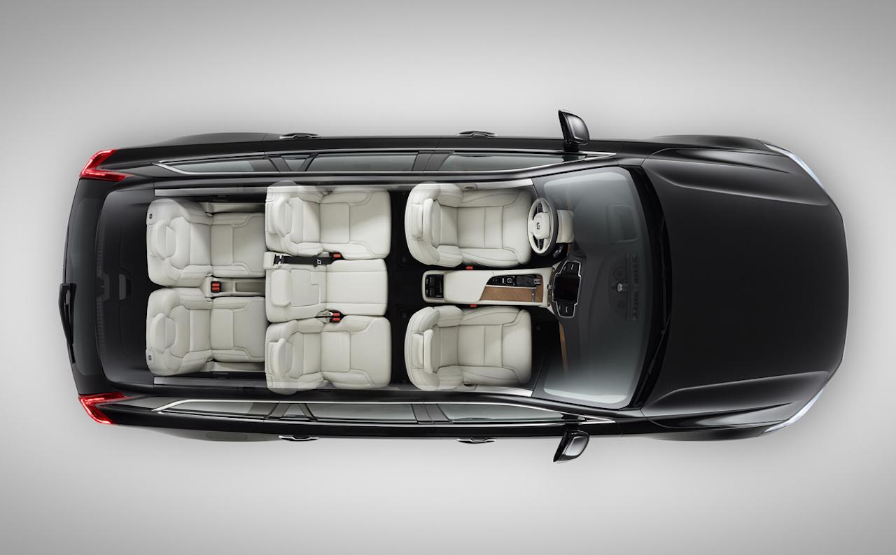 Inside, there's a tablet-style touchscreen in the center console, doing away with physical buttons for the most part, and then throwing in things like leather and wood along with a crystal gear lever made by Swedish firm Orrefors. If you're in the third row of seats, Volvo says there's headroom to suit anybody up to 5 foot 7.