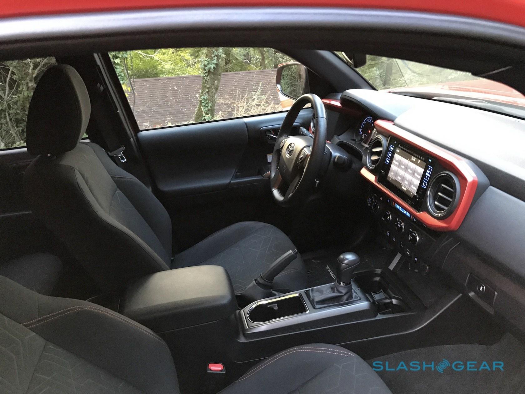 The bolstered feeling continues inside, where it's less welcome. In fact, given the truck's dimensions the interior space on offer feels surprisingly tight. It's functional rather than fancy, even with the splashes of body-colored plastic on the dashboard. Toyota's fabric seats feel just as hard-wearing as the sturdy switchgear. None of it makes much of a claim to being premium, but neither does it feel fragile.