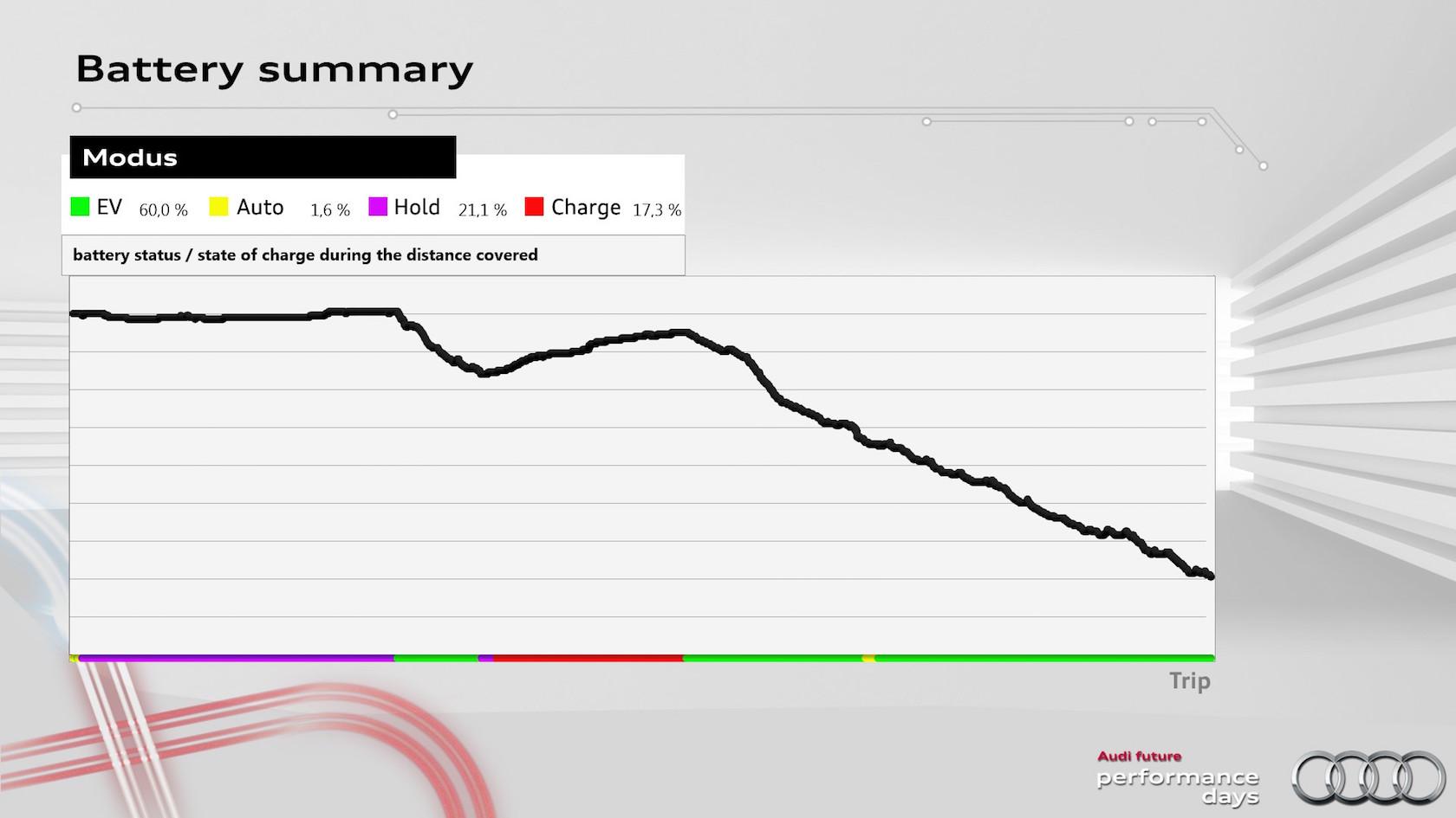 Audi had fitted its small fleet with data-loggers that could contrast what the PEA would do if left to its own devices with how I actually drove. With my fiddling with the hybrid settings, I completed the 97 km (60 mile) route with the combustion engine active 46.7-percent of the time, using a total of 6.9 l/100 km of fuel. That works out to around 35 mpg.