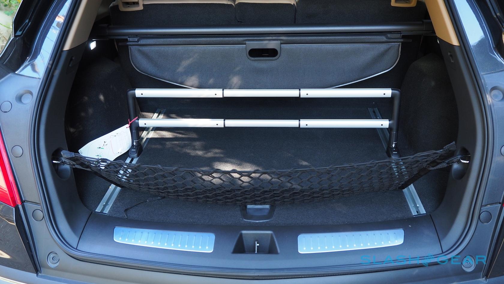 In the back, the seats are even higher and the panoramic glass roof keeps things from feeling too dark, despite the tinted windows, even if it does cut into head room a little. Trunk space is, at 30 cubic feet with the rear seats up or 63 with them down, stronger than most competitors in the segment.