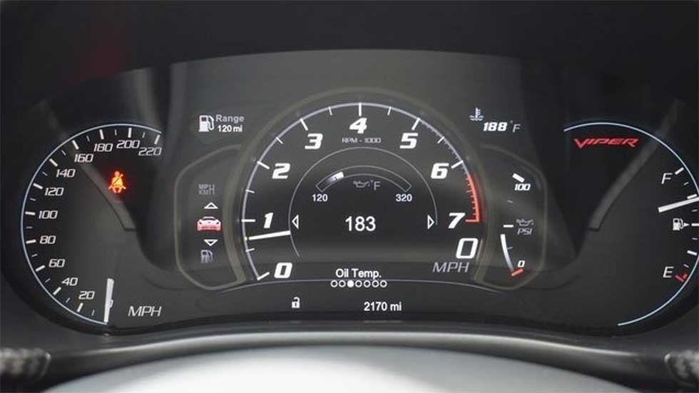 The thing that surprises most about the car is in the shot of the gauges you can see it has about 3/4 of a tank of fuel. However, the distance to empty shows only 120 miles. You don't buy a Viper for fuel economy, but that would suggest a range of less than 200 miles on a tank of fuel.