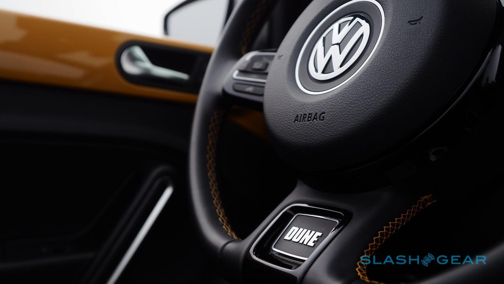 Otherwise, the Beetle Convertible's standard leatherette seats are replaced with special Dune fabric versions, handsome enough with their two-tone grey and yellow piping. They're fearsomely heated, too, as are the windshield washer nozzles. Unfortunately the wheel doesn't follow suit.