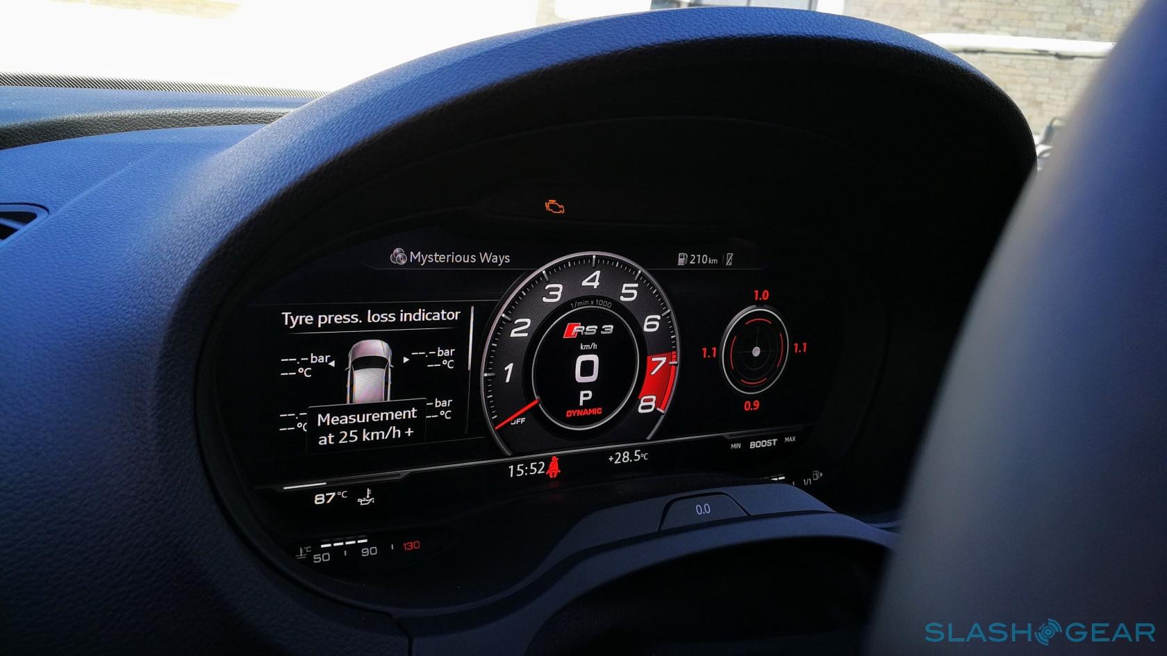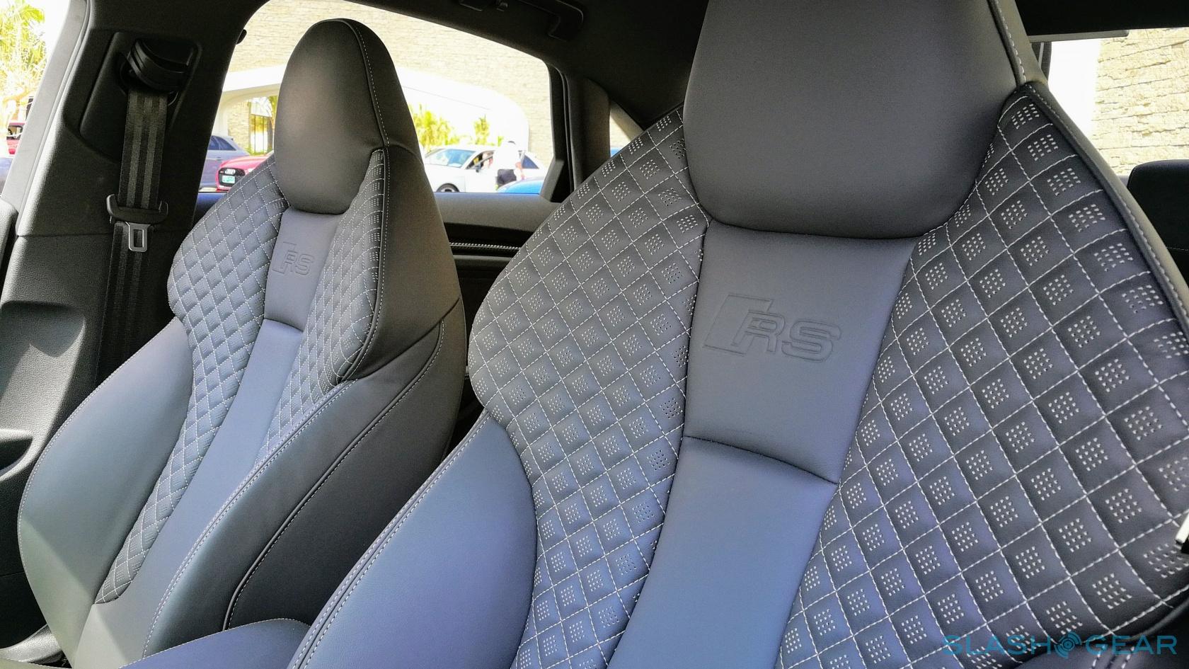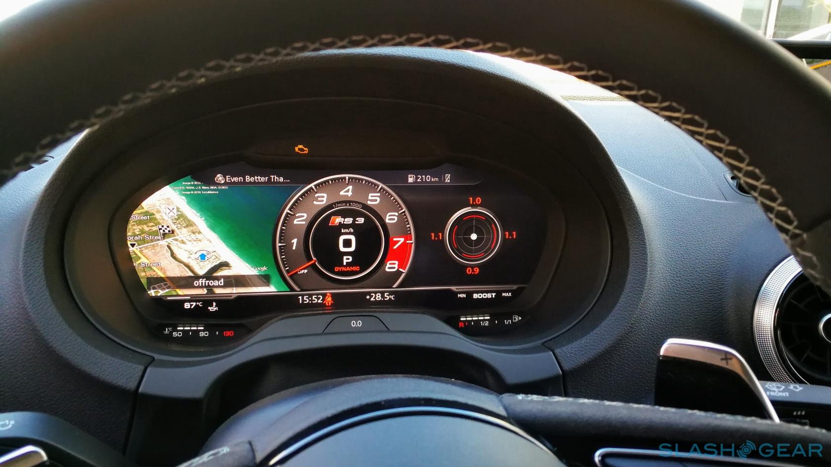 Audi Sport has sensibly kept the S3's best technology in the cabin. Visually, you get Audi Virtual Cockpit, and honestly it alone is worth the price of the package. The 12.3-inch high-resolution display is configurable, with its various panels displaying a variety of driving-related information. The RS-only tach view gets a central rev-counter which lights up in sequential colors to let you know when to shift, flashing urgently as you approach the redline. The other mode takes advantage of the entire display to show Google Earth, whether you're using it for navigation or not. Audi Sport also throws in Audi MMI navigation plus with MMI touch, Audi side assist with rear cross traffic assist, and – if you should tire of the powertrain's own serenade – a great sounding Bang & Olufsen audio system.