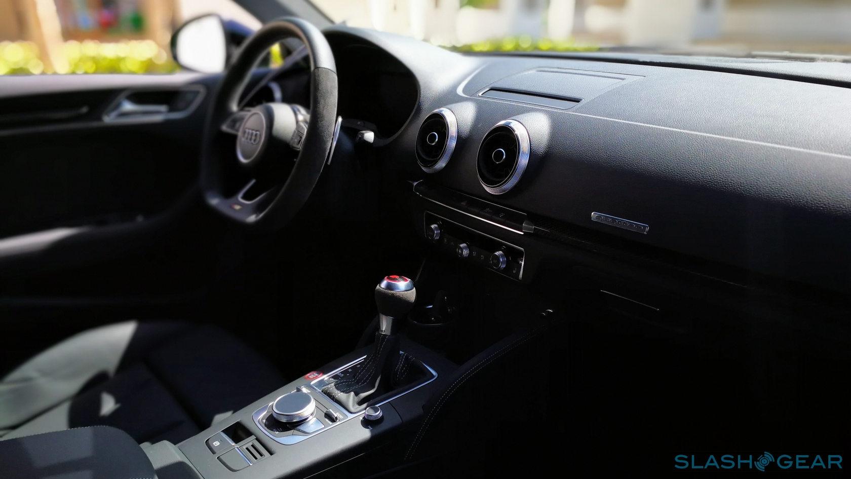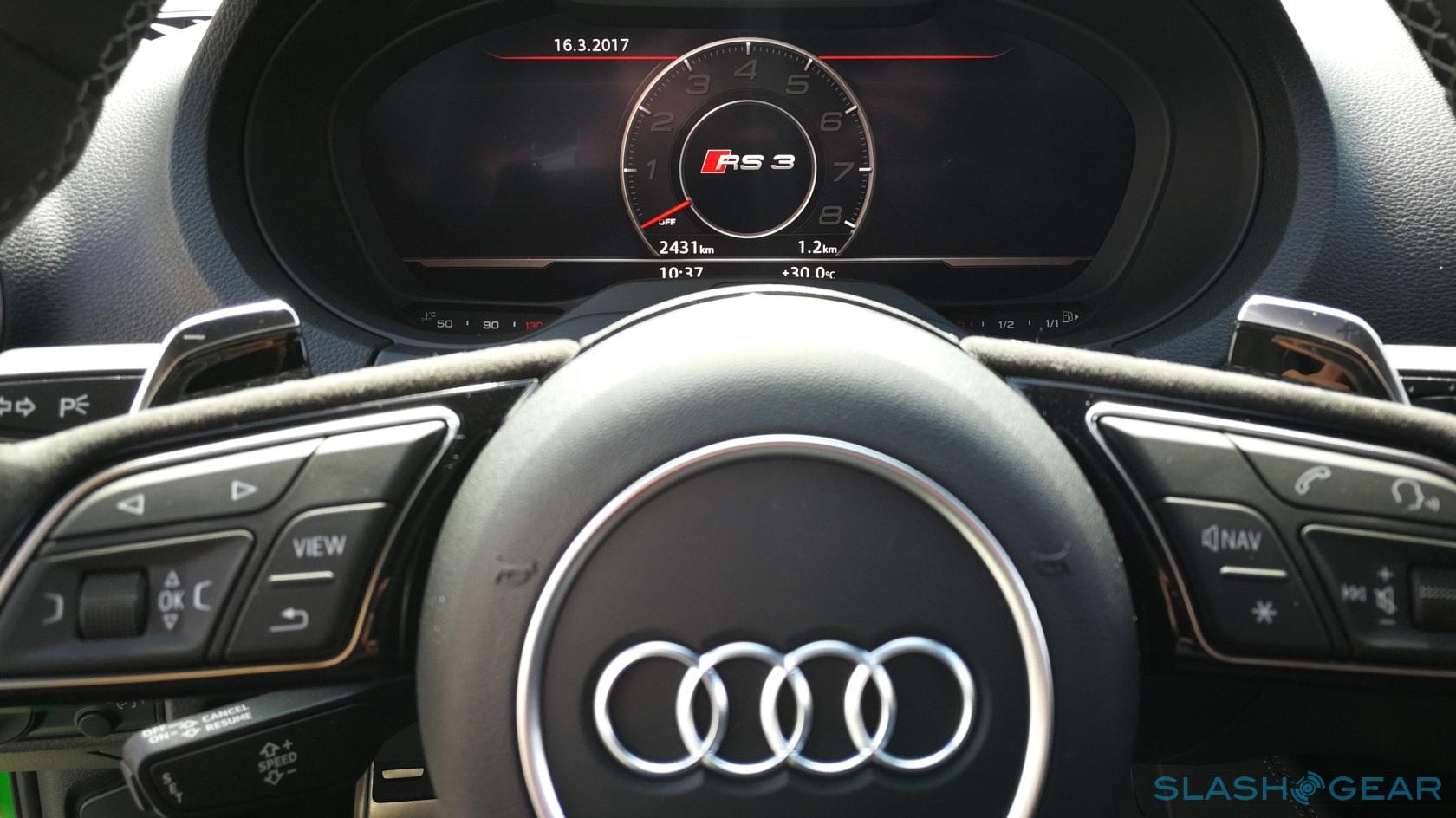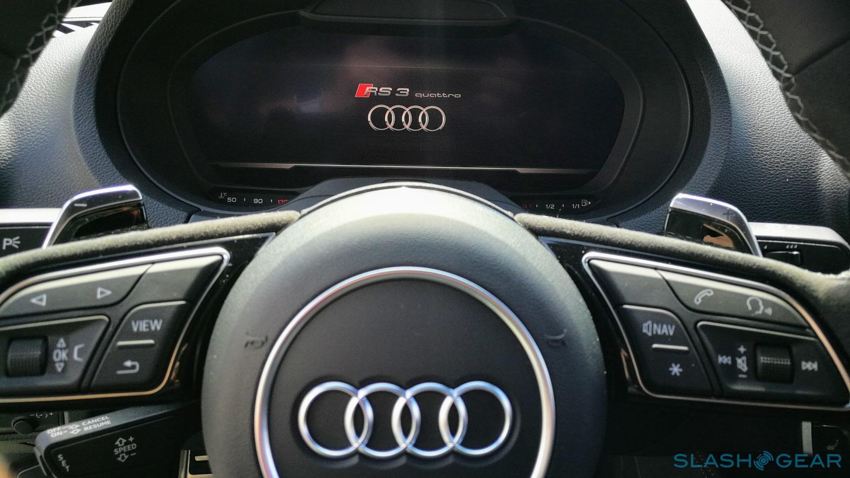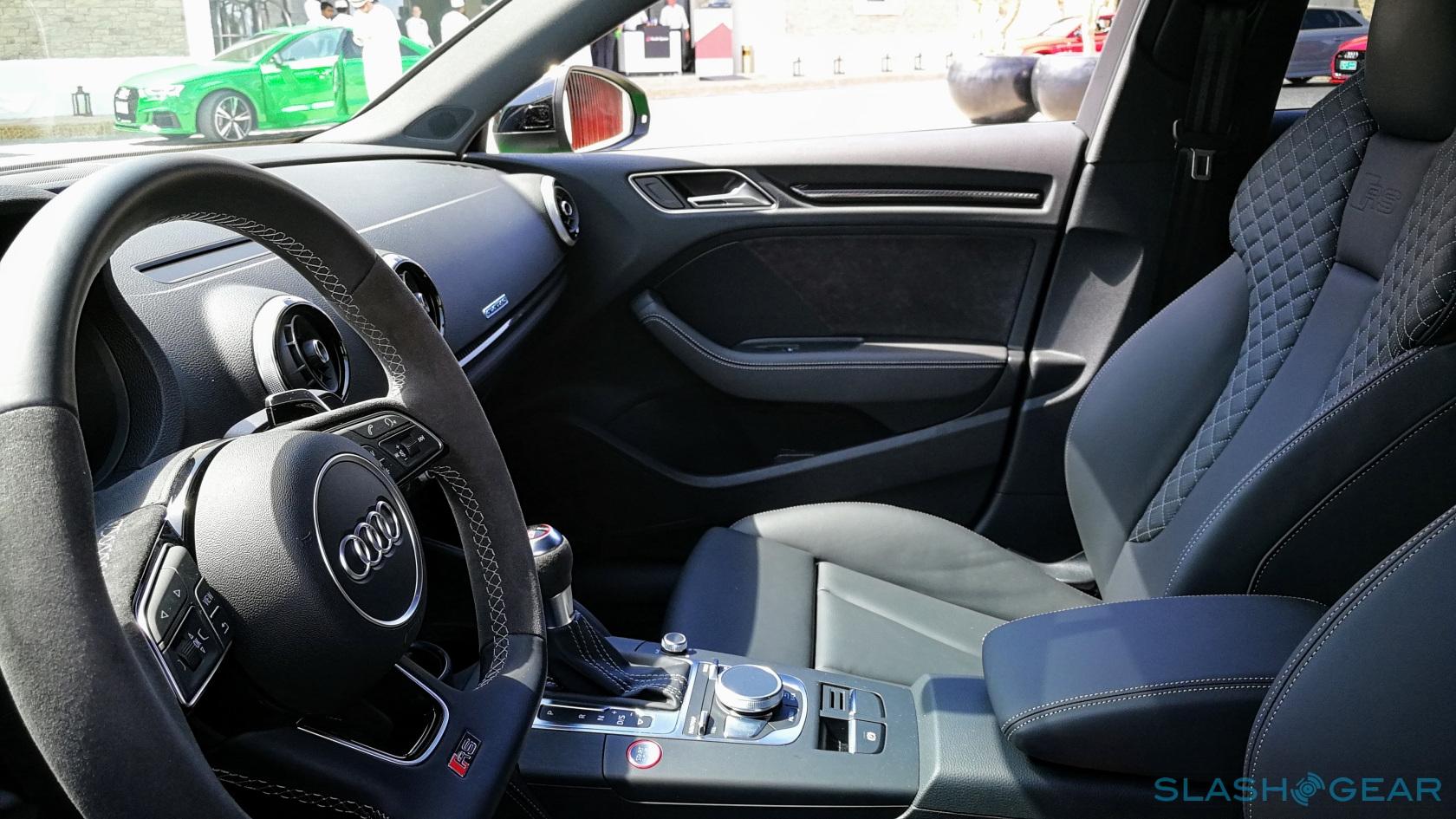 On the outside, while the RS 3 shares the same shell as the A3/S3, is gets a selection of RS-trims like additional air intakes that flank a deeper bumper with "quattro" embossed across the bottom of the grille. The rear is treated to two massive tailpipes, diffusers for reducing lift at higher speed, and a lip spoiler on the trunk lid. If you thought the stance looked meatier than the regular cars, you're not wrong: the front track has been widened by 20mm, a combination of 7mm x 2-wheel offset and 3mm x 2 for a more robust wheel hub. The rear track is 14mm wider, purely from wheel offset.