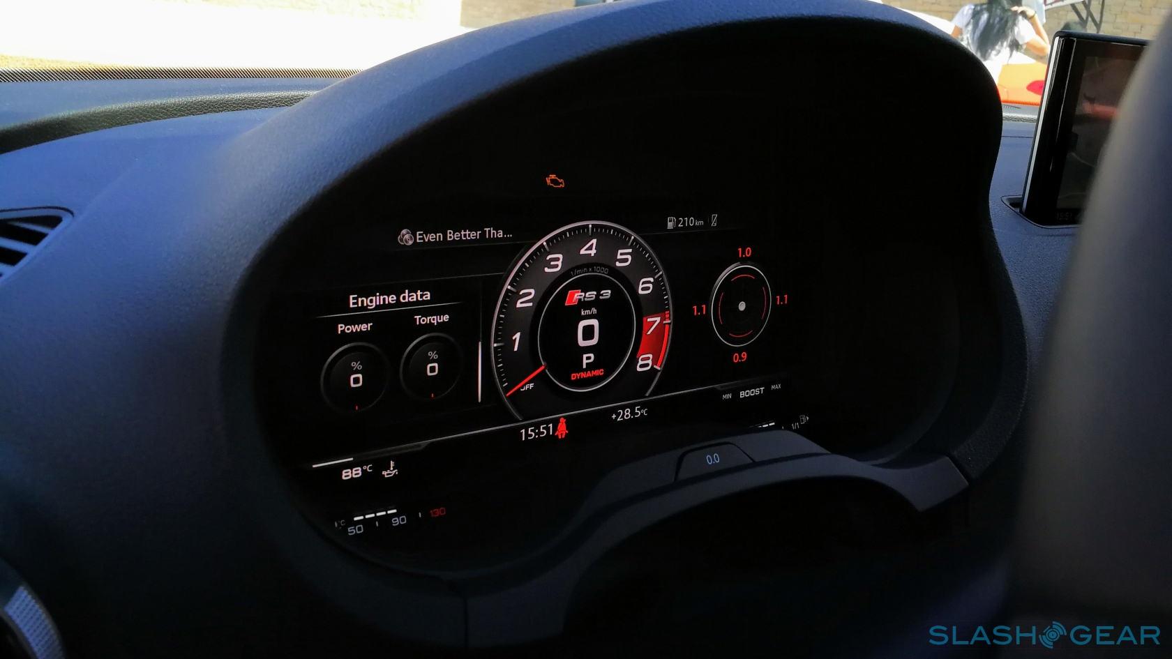 After Audi Sport got its pitch out of the way, my drive partner and I picked were drawn magnetically to one of the two Viper Green RS 3 waiting outside, complete with black optics trim and all the bells and whistles you can check on the order sheet. The Dynamic plus package also comes with RS fixed sport suspension for maximum handling and driving performance; the base trim comes with Magnetic Ride suspension as standard. If you plan on taking the RS 3 to the track, you're better off ticking the Dynamic plus package, though unkempt road surfaces will make themselves known through the stiffened suspension. It also comes with front carbon ceramic brakes and a carbon engine cover. All RS 3 variants have fixed-ratio steering.