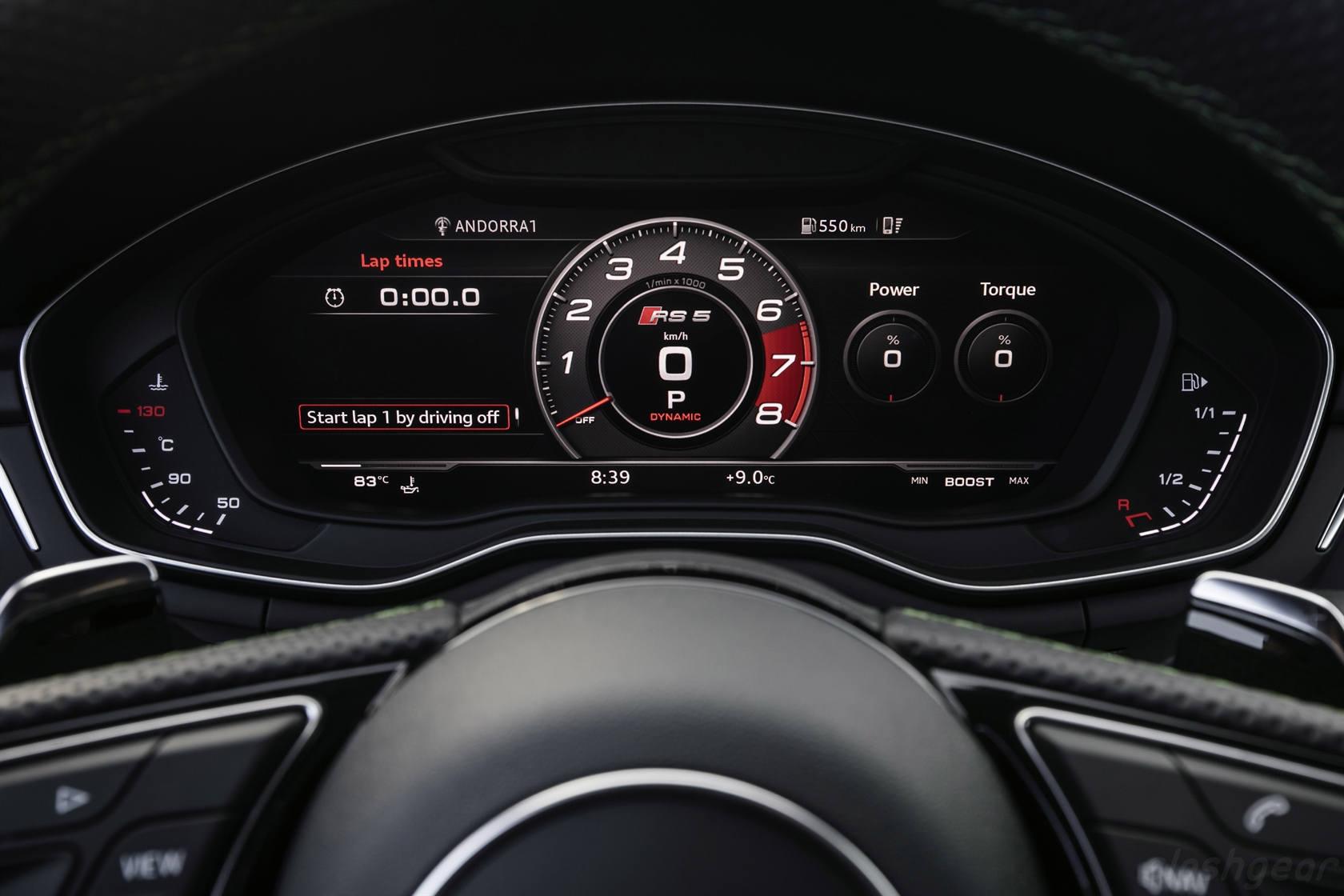 The driver gets Audi's Virtual Cockpit, the all-digital instrumentation binnacle first introduced in the TT a few years back and, since then, available as an option on other Audi offerings. On the 2018 RS 5 Coupe, in the US, it'll be standard-fit, and get a few RS-specific features such as the rev/shift indicator. When in manual shift mode, as the engine comes close to the limit, the center tach flashes up yellow and red bars suggesting that you should shift up immediately. Other RS-exclusive data includes a G-meter, tire temperatures, and horsepower and torque details.