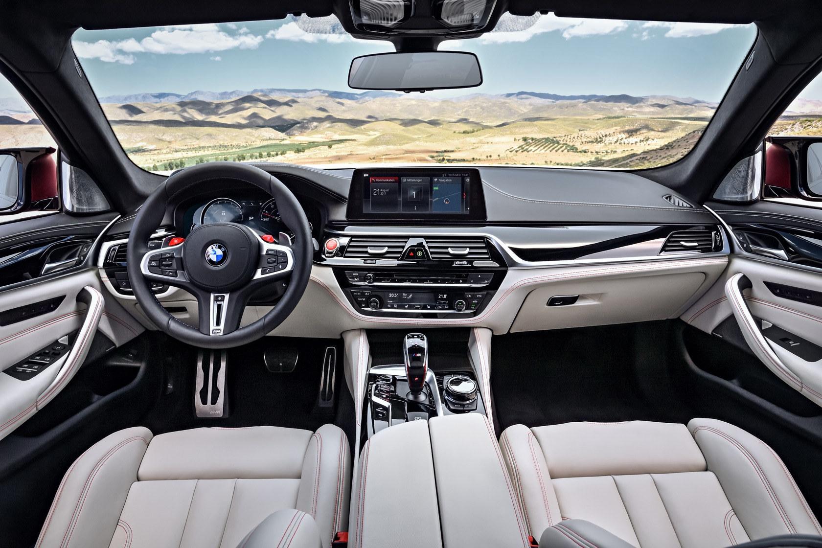 Extended Merino leather is standard, as are sports seats with integral head restraints and thicker side bolsters. All of the driver-assistance tech from the regular 5 Series, including adaptive cruise control and lane-keeping, are optional on the M5, too. There'll be a number of exclusive colors available, including a new Marina Bay Blue Metallic.