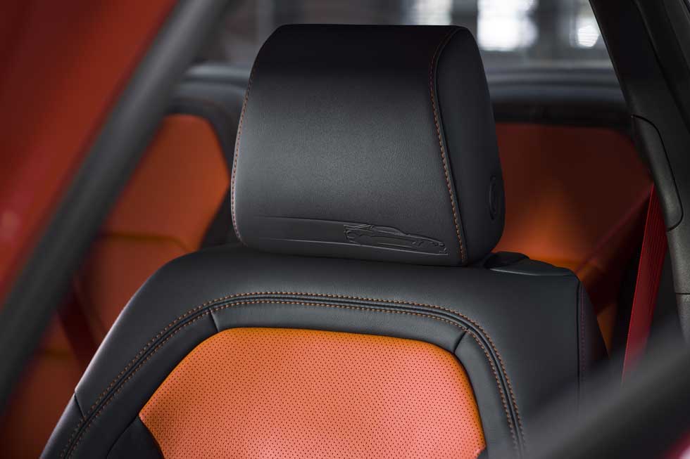 The package is rounded out with embossed front headrests, Hot Wheels badges on the steering wheel and Hot Wheels illuminated doorsill plates. The carpet floor mats have orange stitching and ghost stripes.