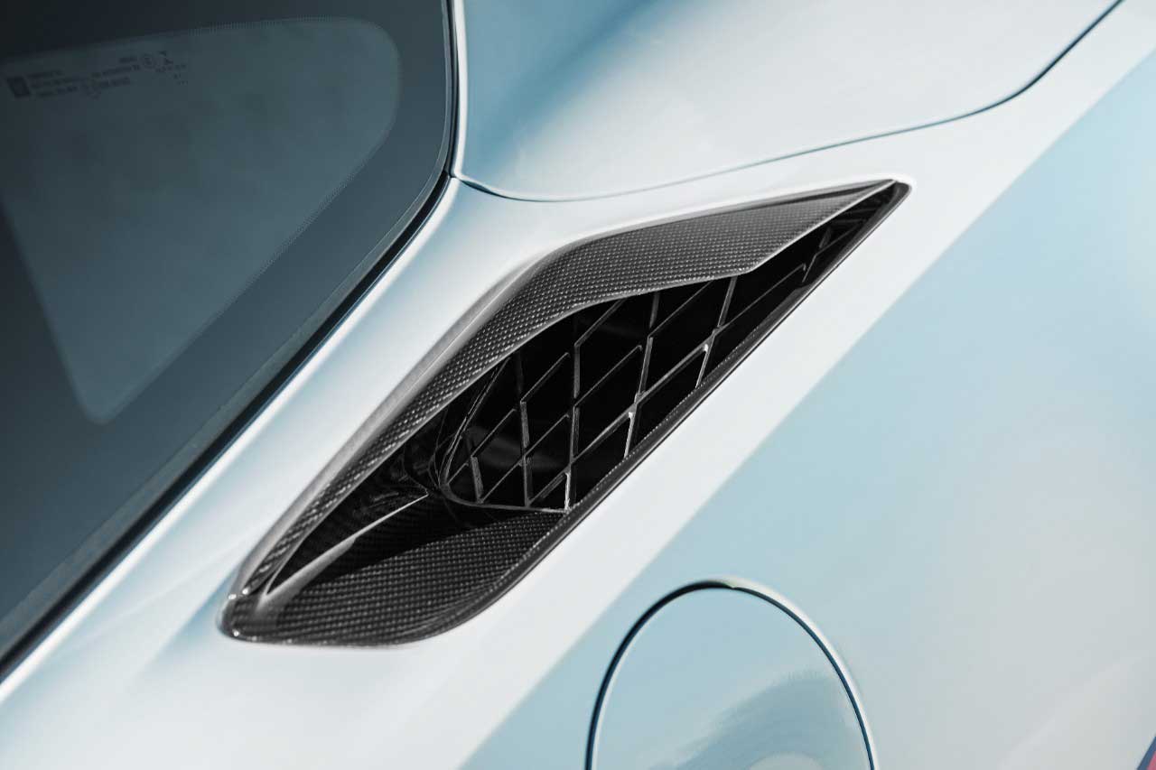The special package has lots of visible carbon fiber elements and a new Ceramic Matrix Gray exterior color. On convertible models, the top is blue on this package. Each car gets unique fender stripes and door graphics. The wheels are special black units with machined grooves.