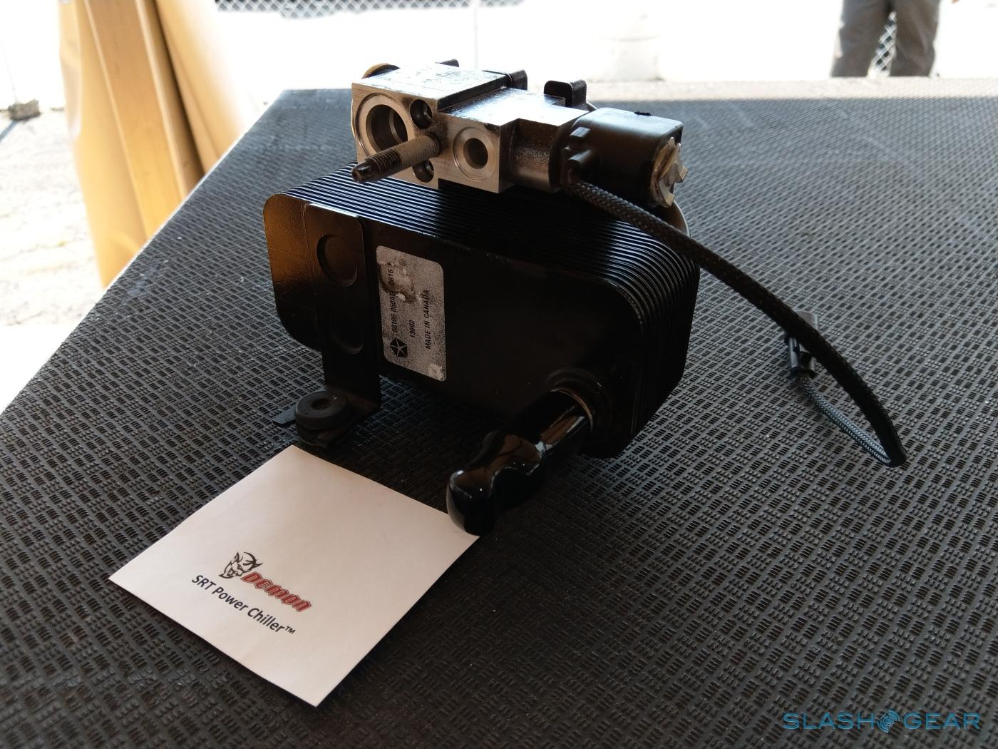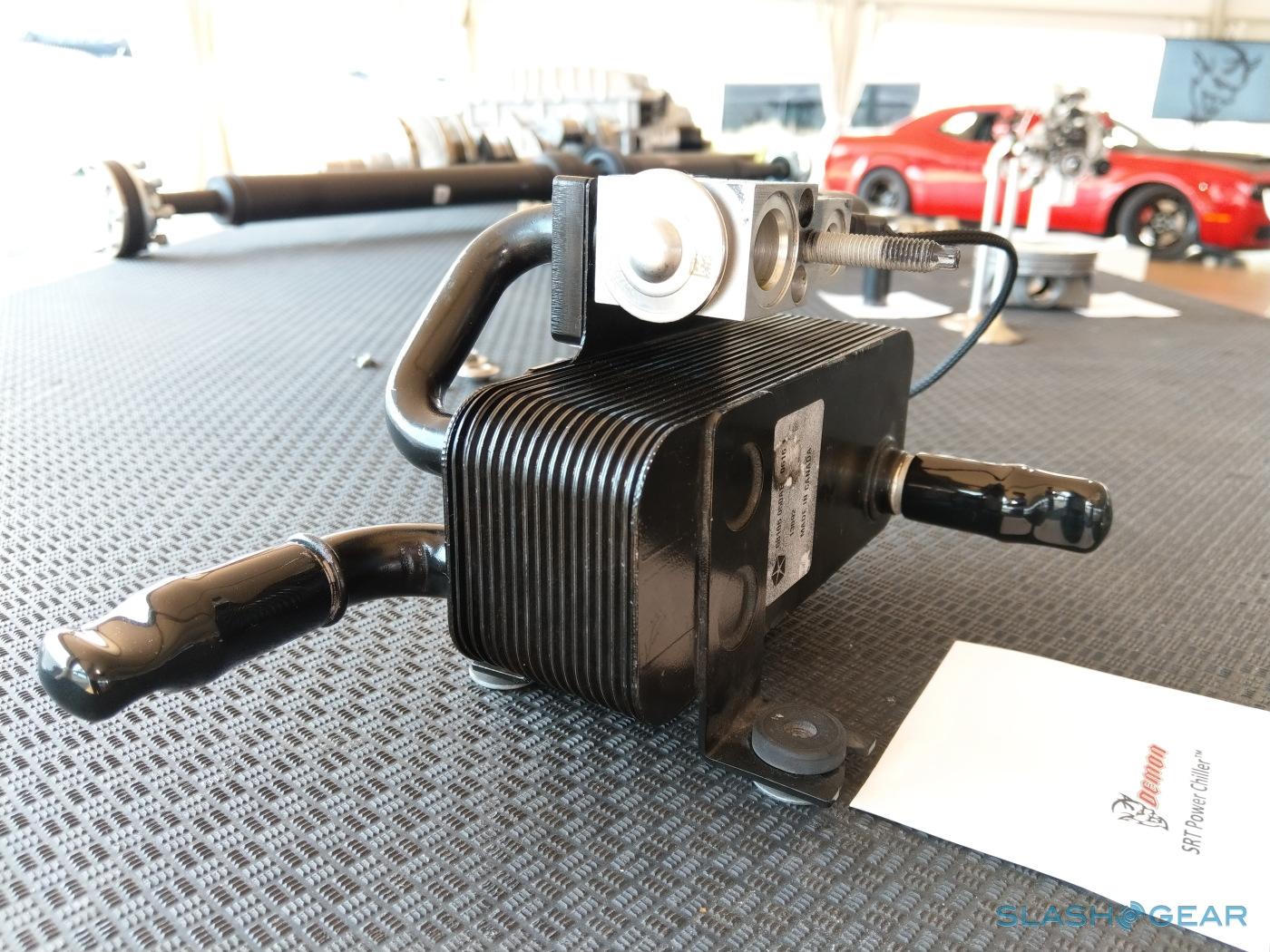 Happily the Demon won't asphyxiate you, at least not directly. All that combustion, though, produces no small amount of heat, and cooling down the engine and all the rest of the components drag run after run is no small feat. Dodge's solution is a liquid-to-air system, a first for production cars, which alone results in a 10 degree centigrade reduction in air charge temperature. It alone squeezes 10-15 more horsepower from the drivetrain. After a run, while the car sits idle, normally you'd suffer heat soak: to prevent that from happening, the after-run pump switches on to keep circulating coolant through the intercoolers rather than powering up the fan. Together they prevent the various components from heating up, so that your second, third, fourth and subsequent runs remain consistent.
