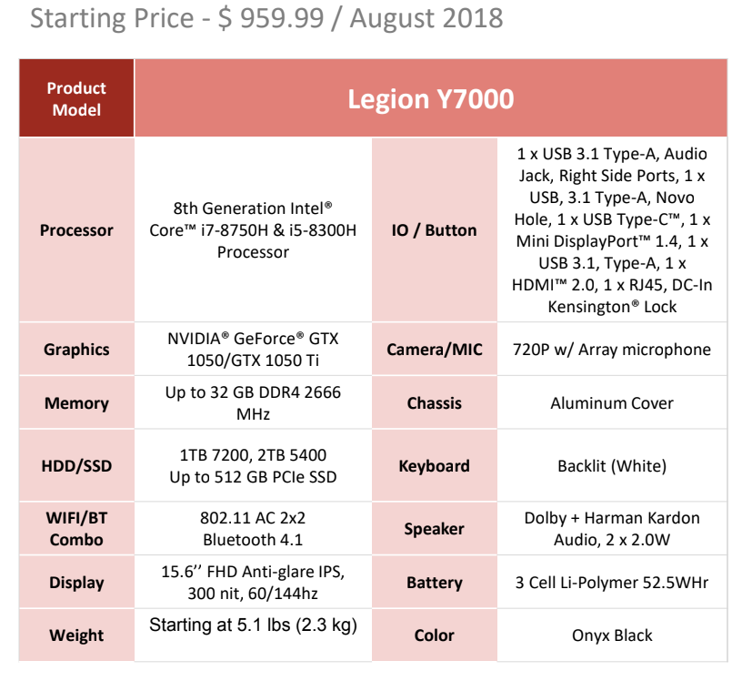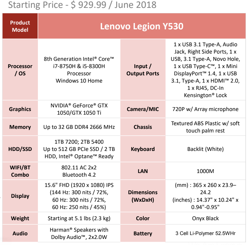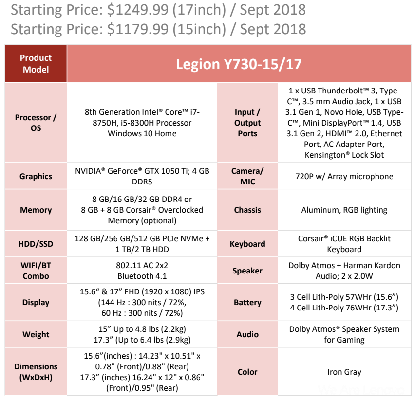 The Y7000 is scheduled to arrive in August of 2018 for general availability starting at $960. The Y530 is scheduled to appear first in June of 2018 for $930. The Legion Y730 series are scheduled to begin to appear in September of 2018 for $1180 (for the 15.6-inch model) and $1250 (for the 17.3-inch model). See the timeline below for more on Lenovo's OTHER Legion machines.