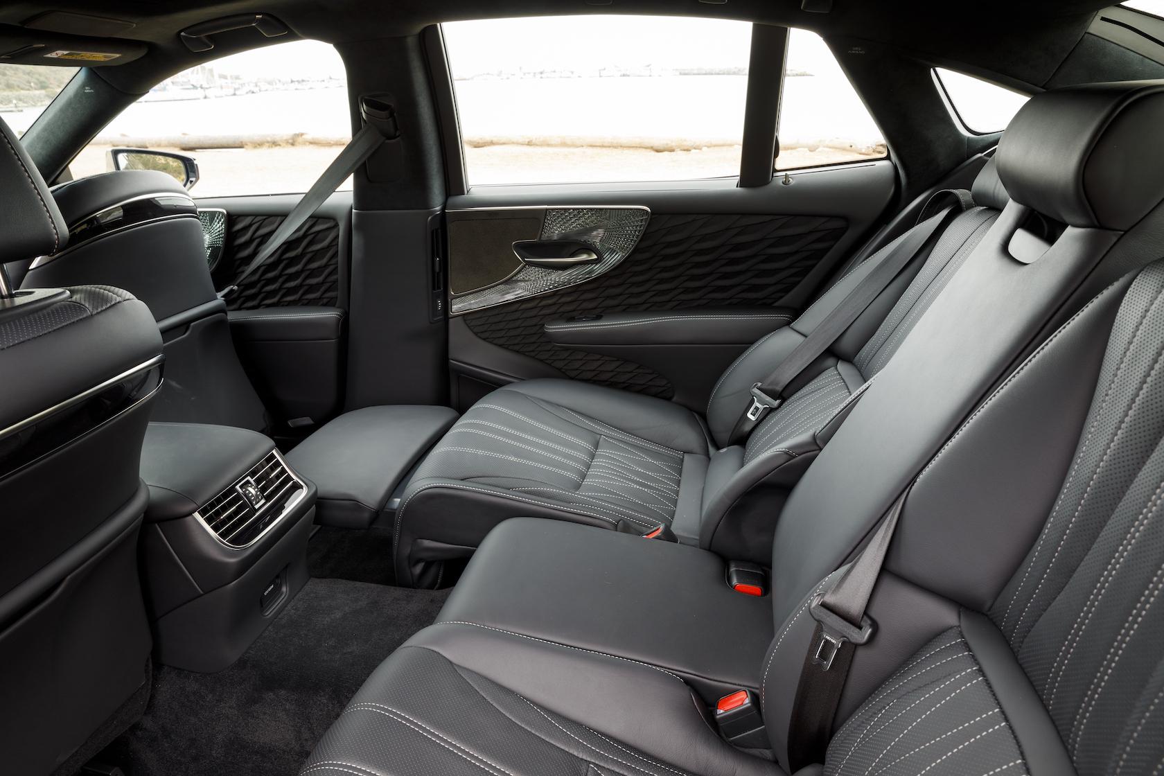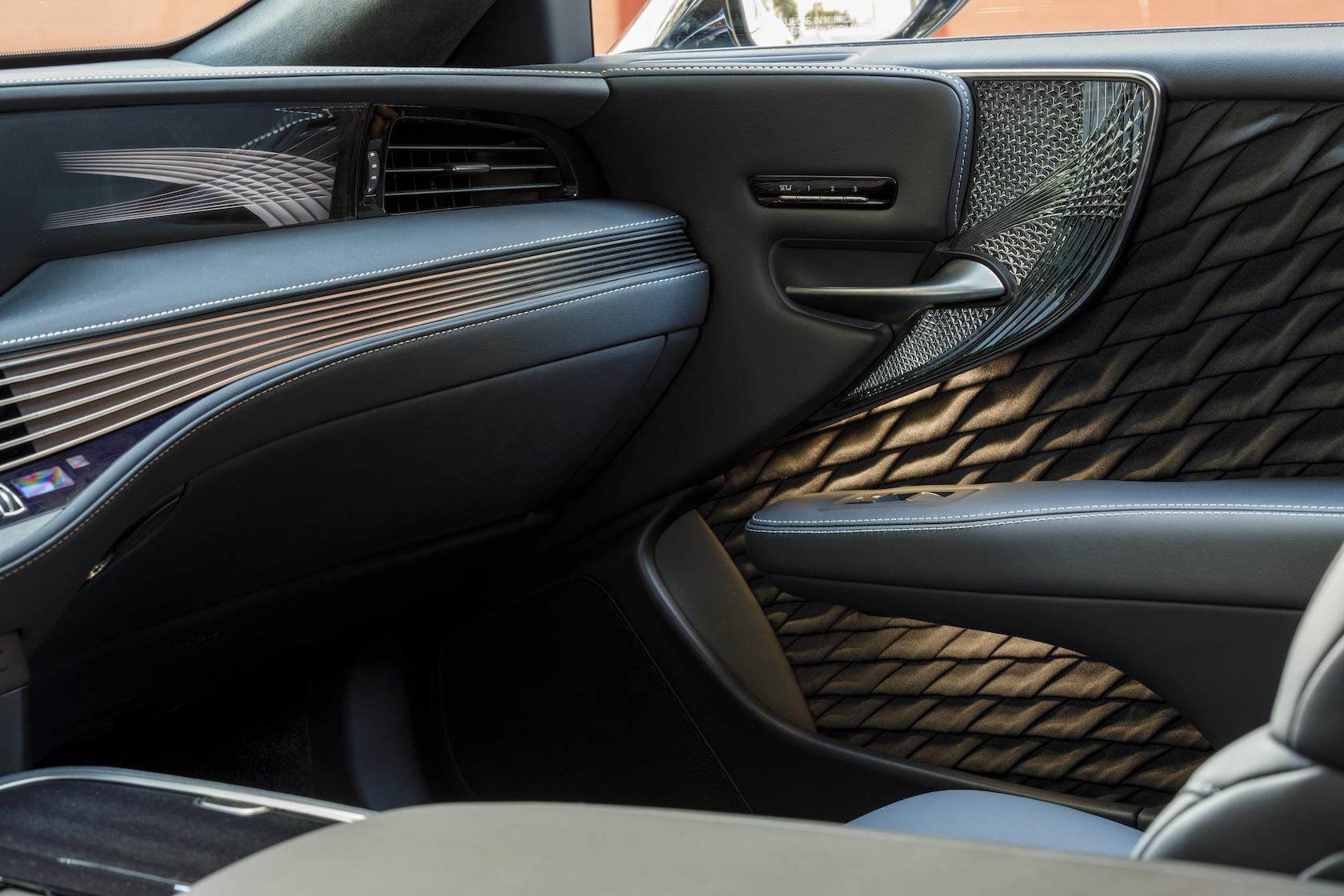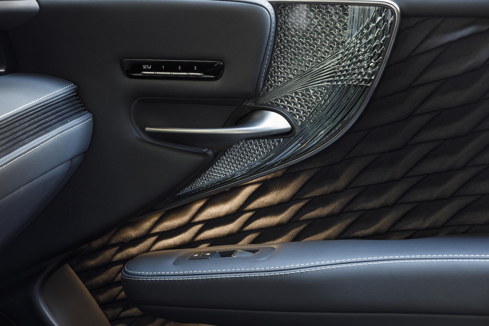 So, Lexus turned to master craftsmen to develop traditional decorative glass panels, which it used as the molds for interior door trim. Rather than just wrapping sections of the cabin in leather, it used origami-style folded fabric. The woodwork is laser-cut, bonded woodgrain slices for symmetrical grain, nestling among swathes of grooved aluminum that echo the blades of a tea whisk. One woman spent eight hours a day, for six whole months, computer-generating the surfaces on the grille: 5,000 of them on the regular LS, and 7,000 on the F SPORT.