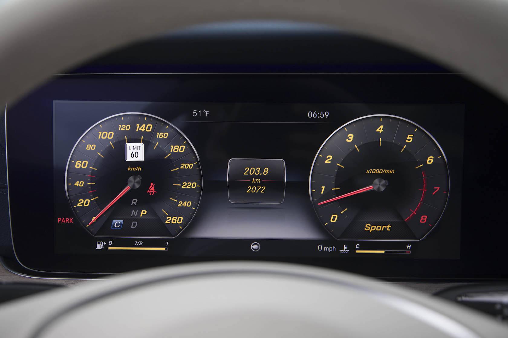 Things really start adding up when you check the tech boxes. You can have a second, huge display for your instrument cluster, together with DISTRONIC semi-autonomous driving with adaptive cruise control, lane-keeping, and auto-lane-changing (part of the $9k+ Package 3 trim). Heated, cooled, and massaging seats are options, as is a fragrance dispenser with a perfume bottle in the glove compartment. Twin touch pads on the steering wheel navigate independently through each dashboard display, though you can also reach down and scroll, swipe, and tap the combined wheel and trackpad in the center console. Luckily there are shortcut buttons for the common features, because the E400 Coupe's menus are legion.