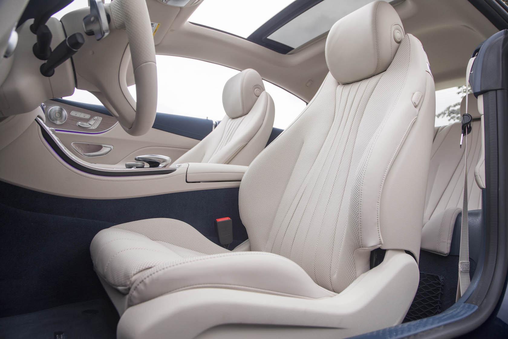 It's a thoroughly comfortable place to find yourself. Mercedes has fitted new, turbine-inspired vents to the dashboard to better distinguish it from the sedan, but further customization comes down to the depths of your pockets. Nappa leather is a $1,370 option, as is the automaker's even finer Designo leather and wood, $4,200 and $1,300 respectively. Your E400 Coupe cabin can be subtle in open-pore wood, yacht-tastic with a pinstriped gloss finish, or spiral off in more unusual directions with love-it-or-hate-it color schemes like beige and blue.