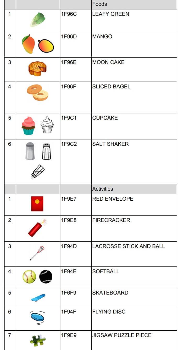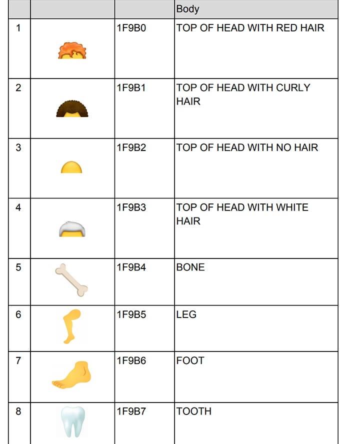 There's several new body part emojis as well, like a tooth, foot, and leg, along with new hair styles like red, curly, and bald. New food emoji include a mango, cupcake, sliced bagel, and the all-important salt shaker.