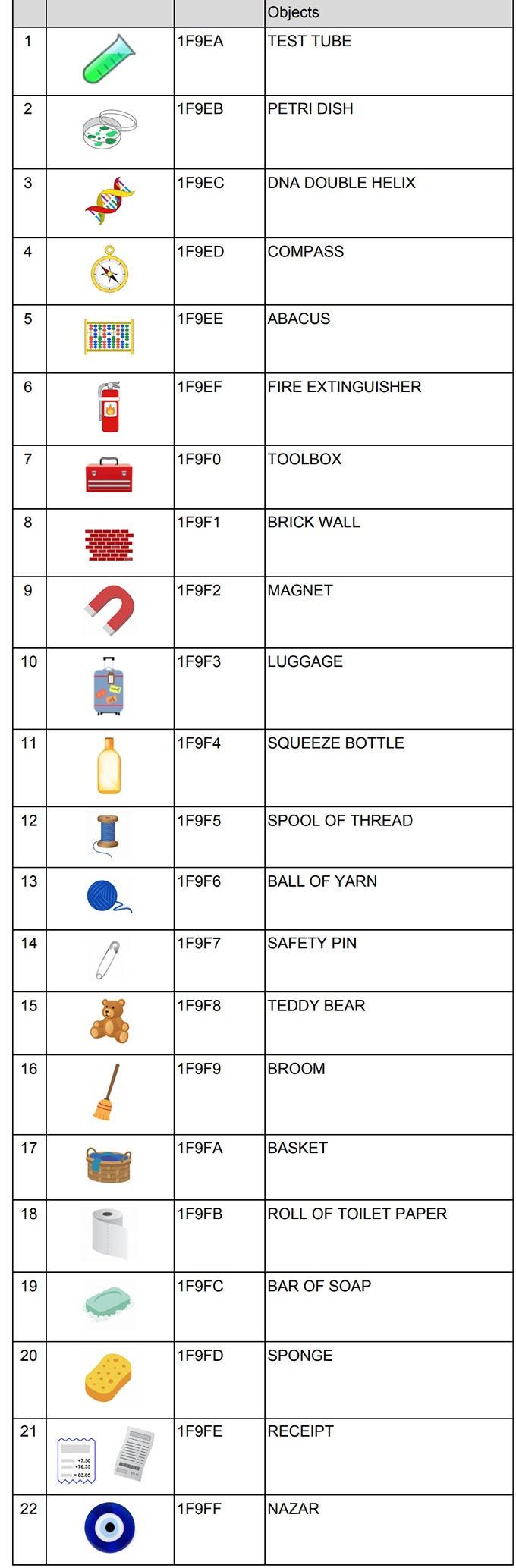 The activities and objects categories see the biggest additions, with emoji for goggles, firecracker, softball, flying disc (frisbee), skateboard, fire extinguisher, magnet, test tube, DNA double helix, abacus, brick wall, ball of yarn, sponge, broom, and — to go with that new poop emoji — a roll of toilet paper.