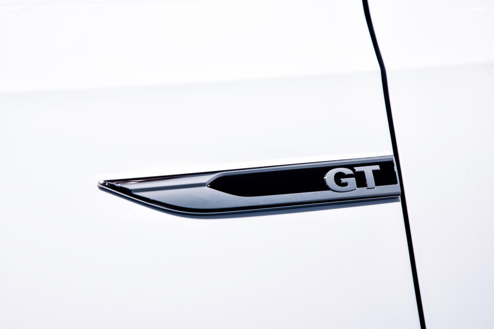 The roof is finished in black, as are the mirror caps, and the window and door trim. Two-tone 19-inch "Tornado" wheels are standard, with red-painted brake calipers. The rear has a black spoiler and tinted LED taillamps, together with black trim on the bumper and a double exhaust with VW's acoustic package.