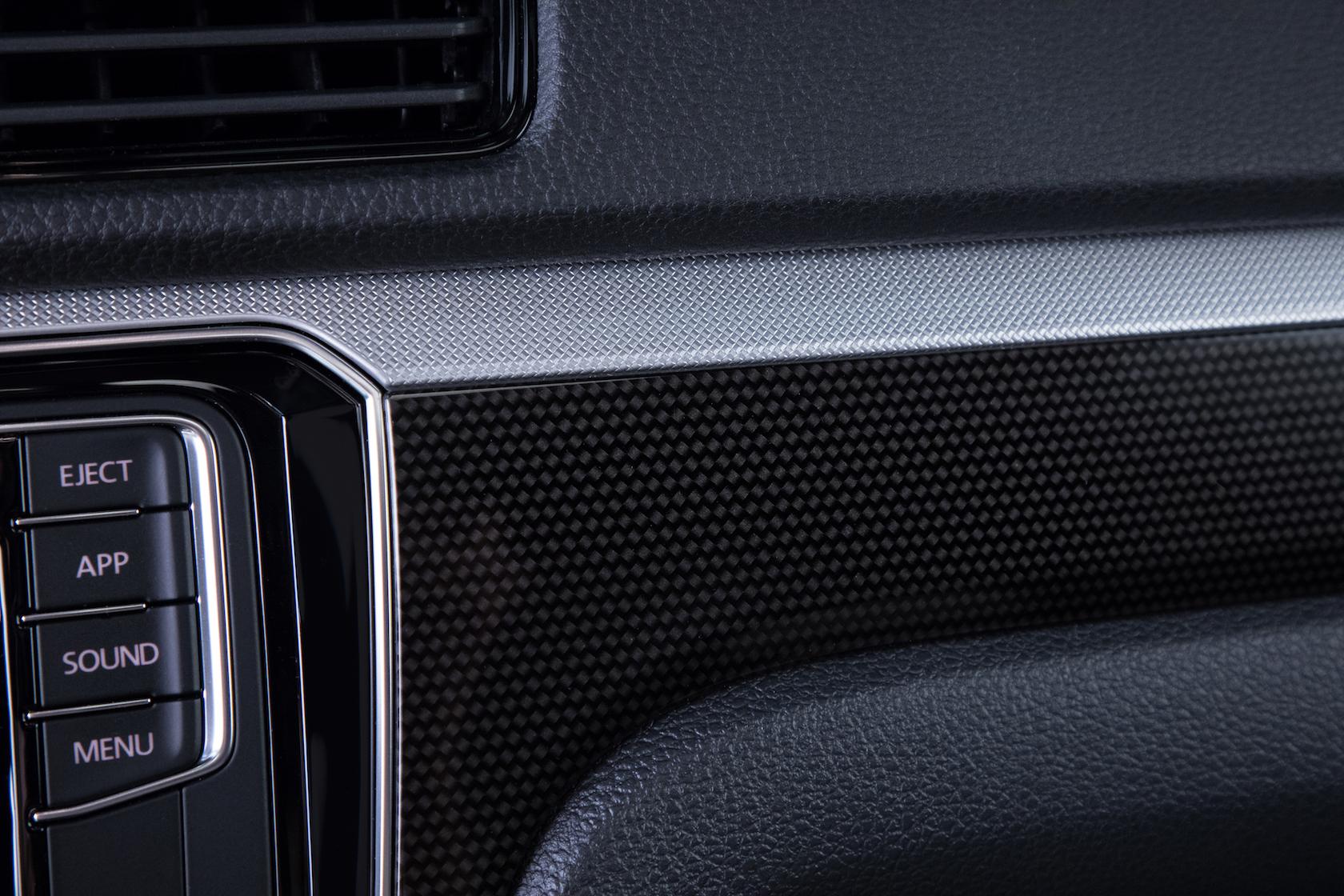 As for the cabin, there's both styling and tech upgrades. The center console is piano black, as is the vent trim, and there are carbon fiber optic trim pieces. Black leatherette is used on the seats, with gray inserts and contrast stitching. The wheel gets real leather, and the front seats are both heated, as are the side mirrors. Dual-zone climate control and an 8-way power driver's seat are also included.