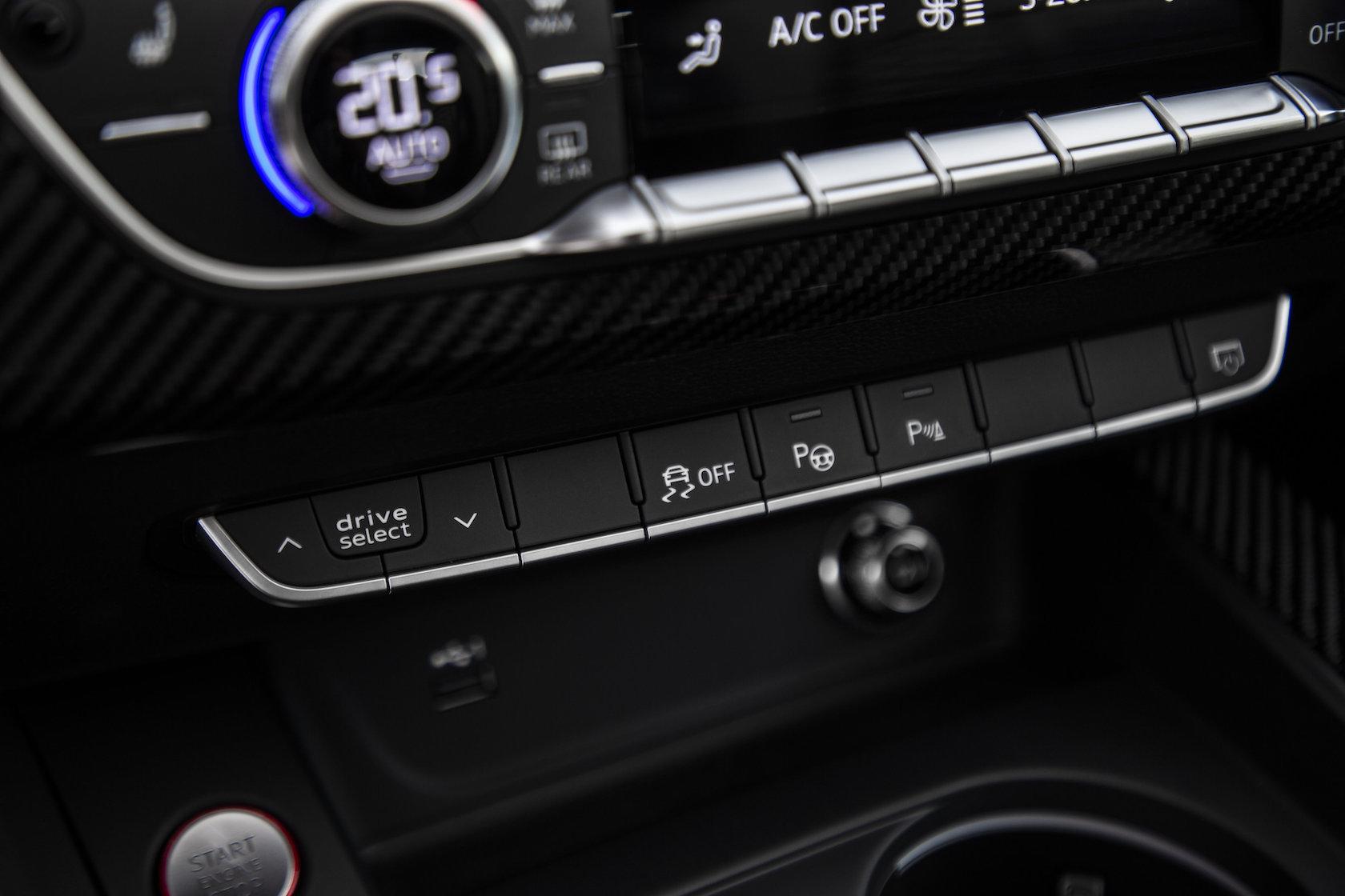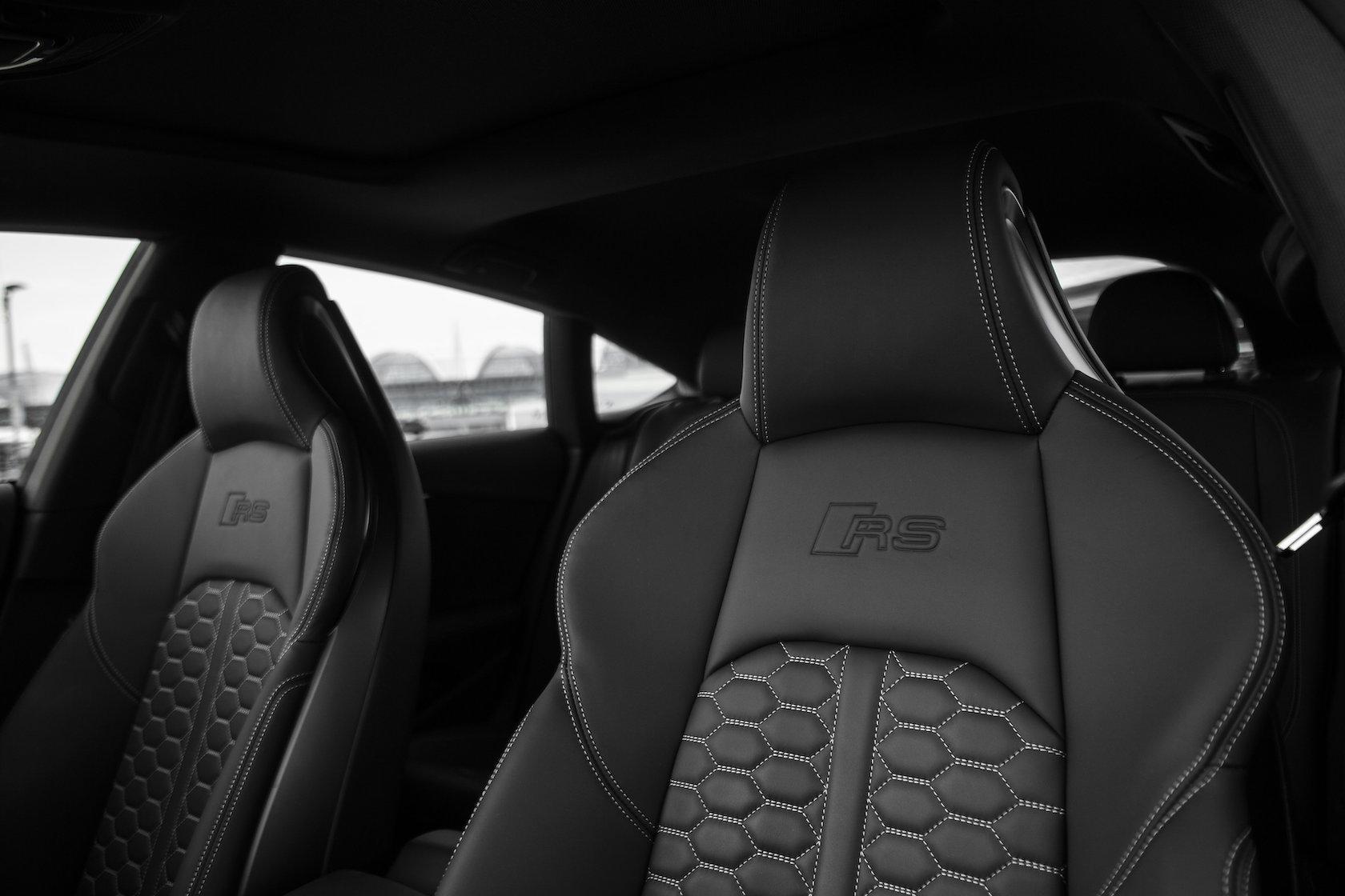 Inside, Audi's crisp and modern aesthetic is in strong evidence, with a nice mixture of luxury and sportiness. Roomy enough to accommodate five adults, it's nonetheless focused primarily on the driver. That means a chunky, flat-bottomed steering wheel, and plenty of seat bolstering. The seats themselves are wrapped in soft leather, and finished with hexagonal stitching in body-colored contrast thread. Carbon fiber and Alcantara adorn the doors and the dashboard. All in all, it's not a bad place to be in.