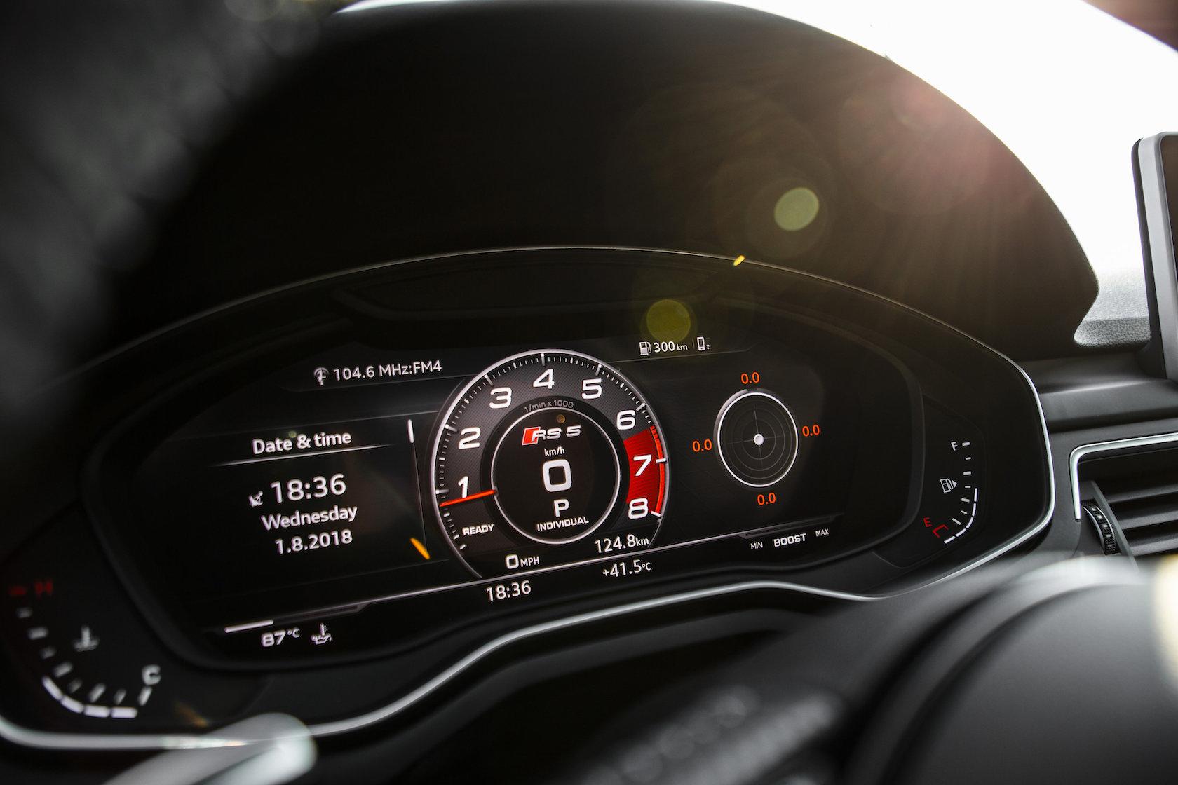 Like the Coupe, the RS 5 Sportback can be had with Audi's Virtual Cockpit, a fully digital 12.3-inch instrument display that can project driving information and Google Earth mapping. Switch over to Dynamic mode and the instrumentation is dominated by a larger central tachometer; there's also a lap timer, G-meter, and horsepower and torque gauge. Right in your line of sight is an RS-specific head-up display, with engine oil temperature, speed, driving directions, and shift indicator lights. For those times when you're cruising, there's adaptive cruise control, traffic sign recognition, and lane keeping assistance. Clever stuff, though I couldn't help but miss the dual touchscreen infotainment system Audi has used in the A8, Q8, and other recent cars.