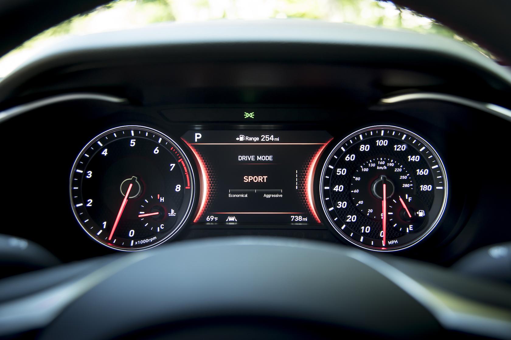 All well and good, but that embrace of gadgetry only serves to highlight some of the other, less welcome decisions. The 8-inch touchscreen perched atop the dashboard feels small, uses the same graphics as a Hyundai half the G70's price, and there's no full-digital instrumentation option, only a smaller color display sandwiched between analog gages. You can't use the LTE connection as a WiFi hotspot, something Genesis told me was a conscious decision (and a baffling one, at that). There are buttons and switches and dials everywhere – some more than a little familiar for those stepping in from a Stinger GT – leaving the cabin feeling more cluttered than it needs to be.