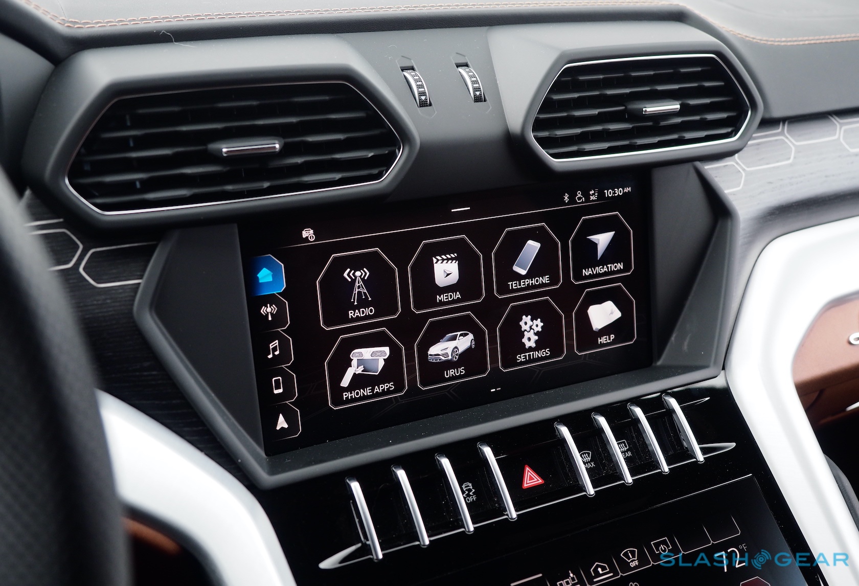 Inside, meanwhile, it's a mixture of classic Lamborghini, some bizarre detailing, and, yes, some parts-bin sharing with Audi. The center console is a reminder that Lamborghini has never met a surface it doesn't deem worthy of extra creasing. The vents and switchgear are sculpted and embellished. Audi donates its twin-touchscreen infotainment system, tweaked a little up top with some custom graphics; yes, the critics may scoff, but if you've going to borrow software then this is at least a decent system to crib from.