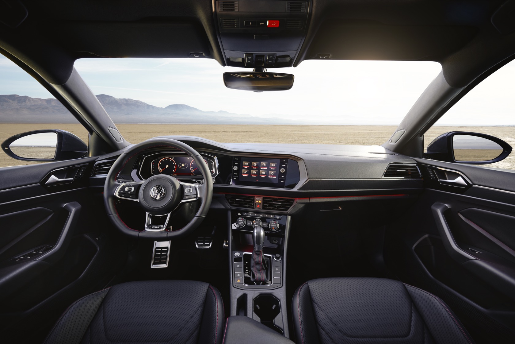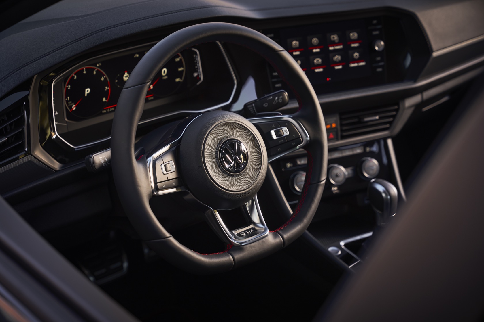Independent sport suspension and the same 13.4-inch ventilated front disc brakes as the Golf GTI are standard, plus the VAQ electronically controlled, torque sensing limited-slip differential. The 2019 Jetta GLI 35th Anniversary trim will get DCC adaptive damping. Inside, there are heated seats and dual-zone climate control as standard, plus Apple CarPlay and Android Auto.