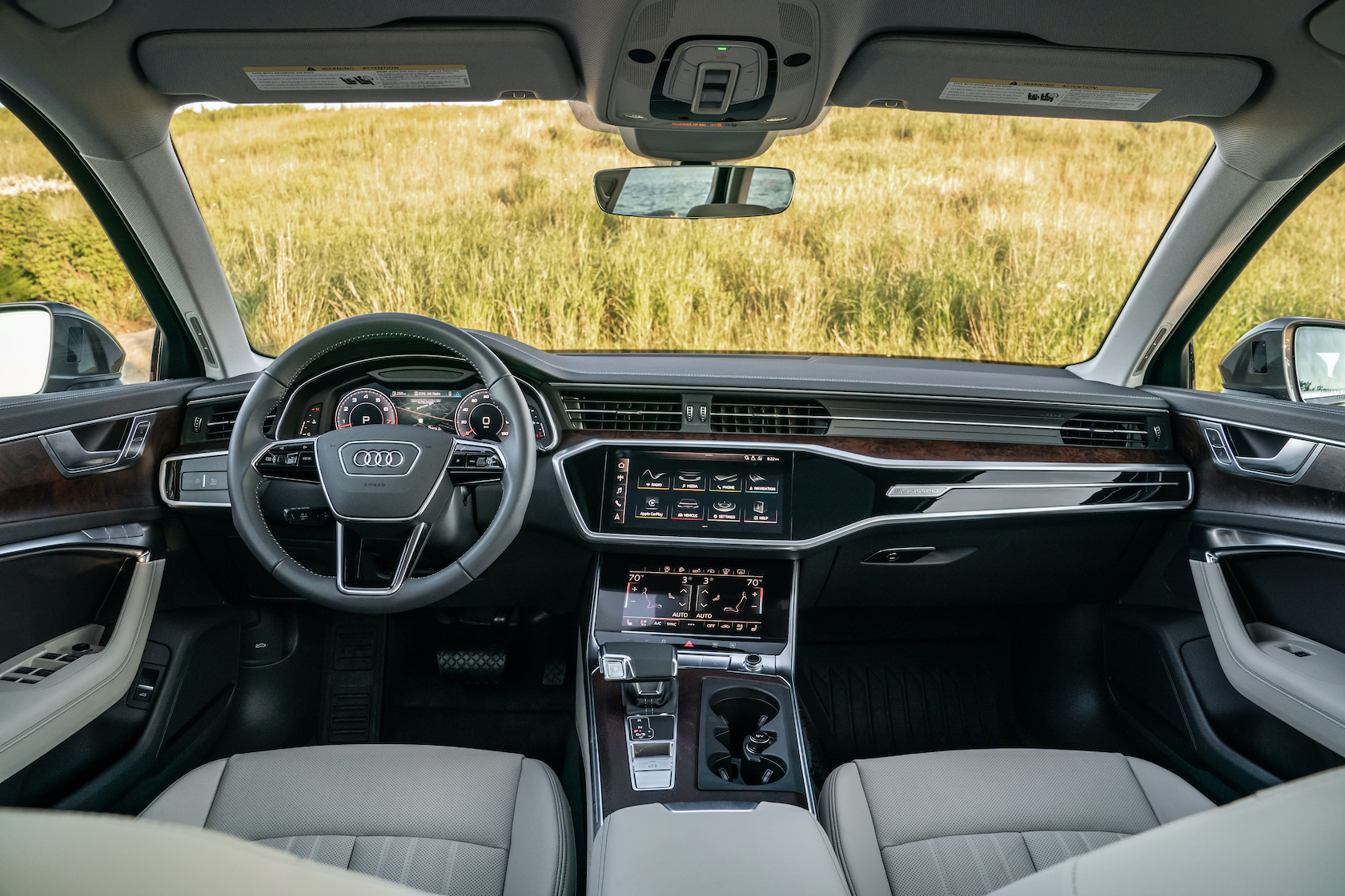 The reality, of course, is that most SUV owners don't take their vehicles off-road either. Audi's styling exercise, then, plays an above-average role in sealing the deal, and to my eyes does so handsomely. The wider grille with its chromed vertical slats, Matrix-design LED lights, and aluminum trim panels emphasize the A6's already-successful curves and slashes; the 20-inch 10-spoke wheels trade a little of the delicacy we've seen on recent Audi performance models in favor of a more reassuring heft. The Allroad clads them in all-season rubber by default.