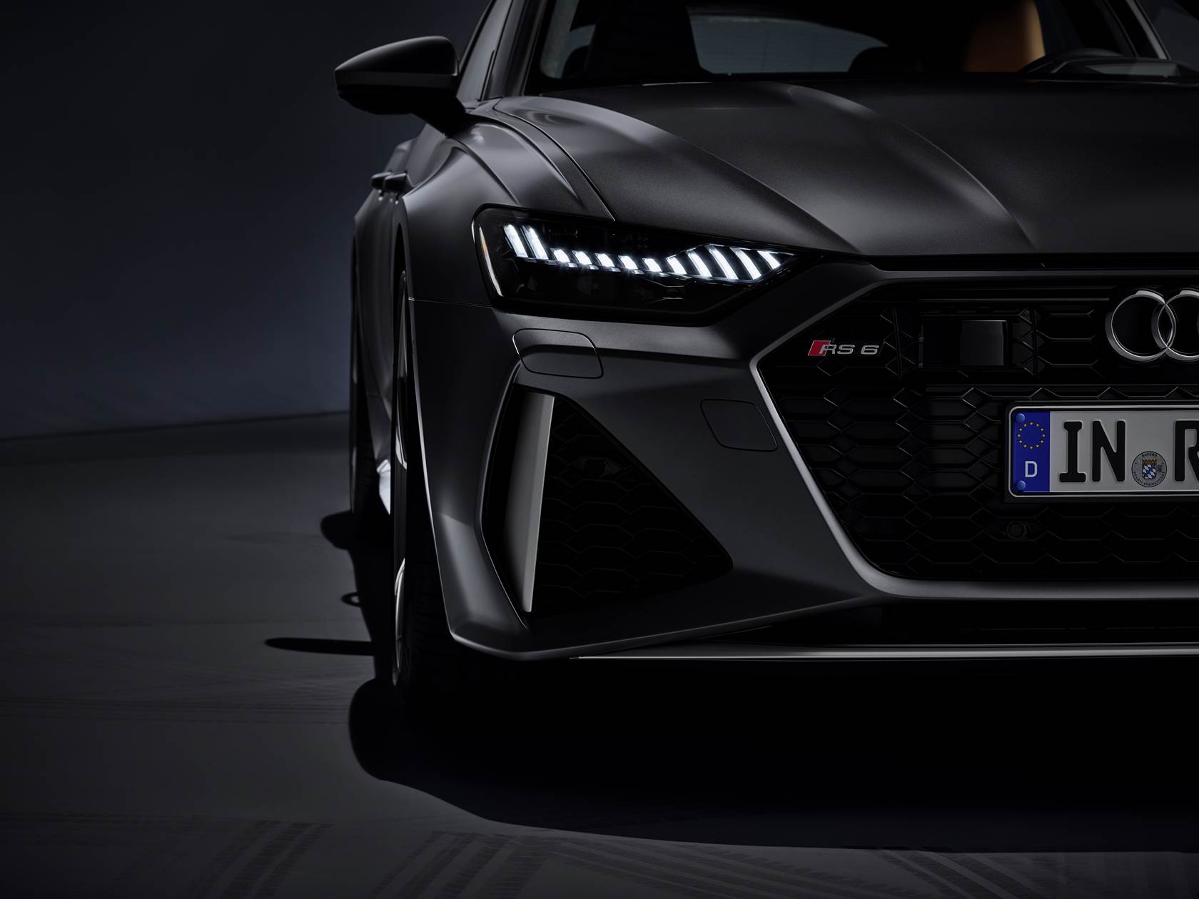 22-inch wheels are housed under flared wheel arches, further accentuating the outsized proportions of the car. The RS6 gets a new power dome hood and the front headlights of the A7, which can be optioned with RS Matrix LED laser lights. They flank a three-dimensional honeycomb Singleframe grille in gloss black.