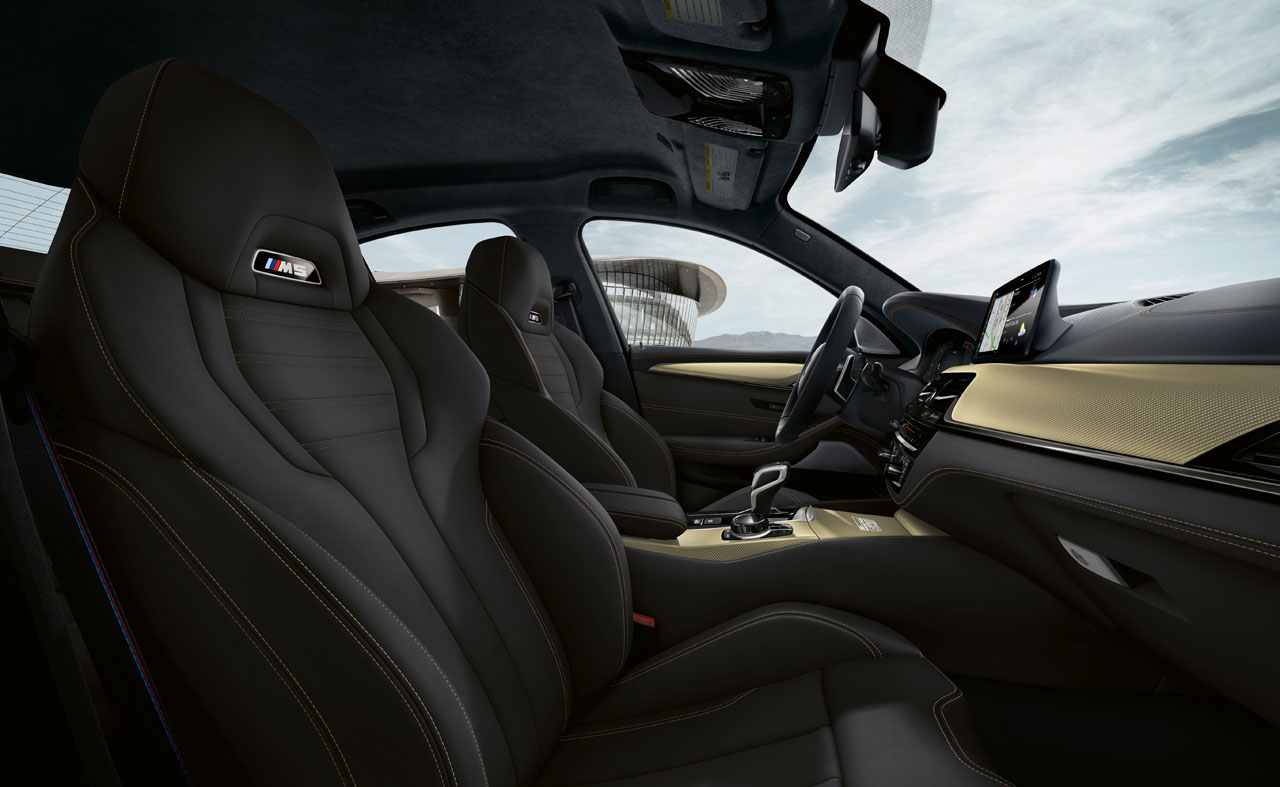 Inside the car is fitted with M Sport sets finished in BMW Individual Merino black full leather with contrasting beige stitching. The center console, door trim, and instrument panel are finished in shimmering, gold anodized aluminum structures as standard. All M5 Edition 35 Year Package cars include the M5 Executive Package and M Driver's Package.